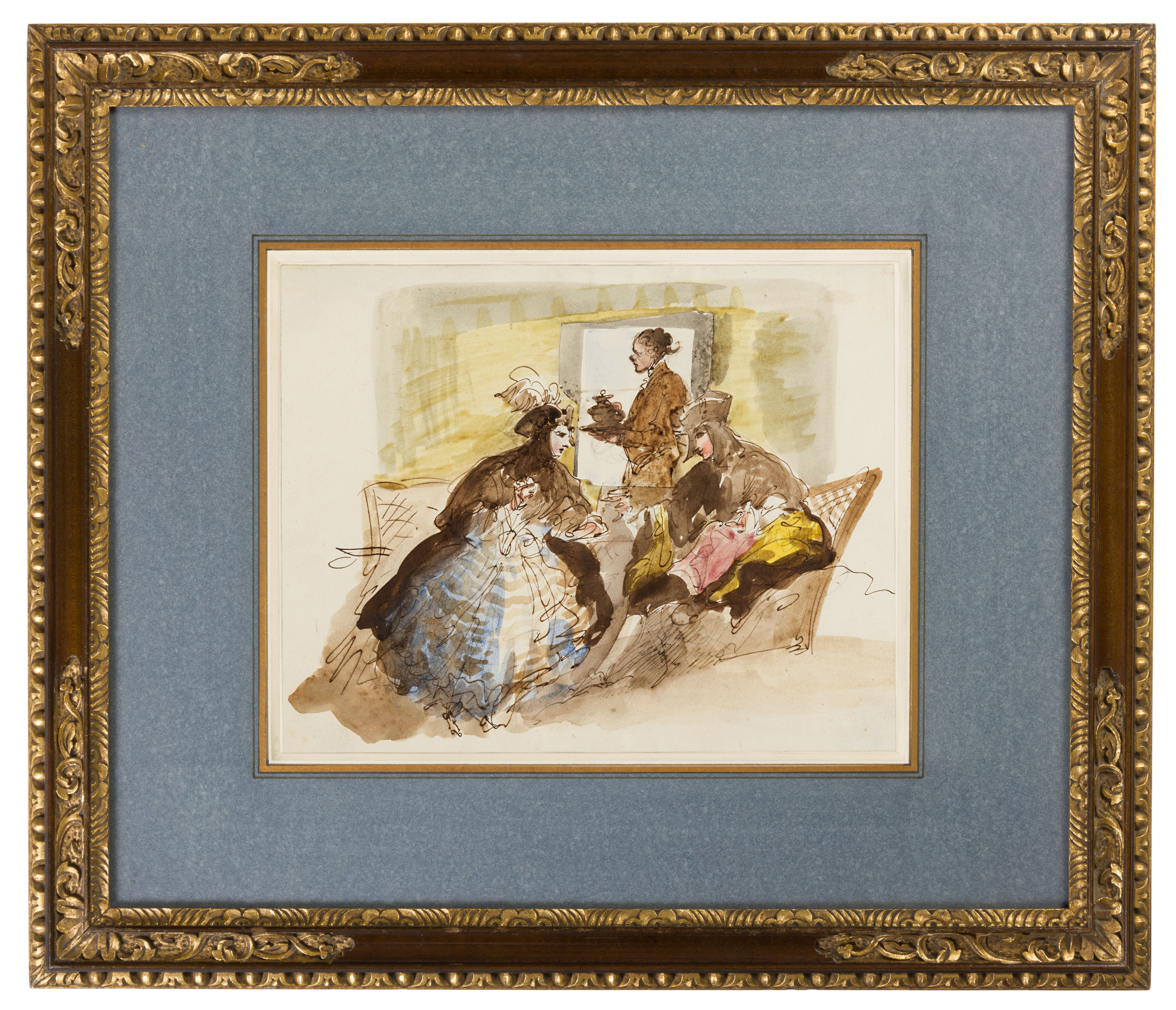 The drawing provides an interesting insight into Bison’s working methods, since the figure of the servant has been drawn on a separate sheet of paper and carefully inserted into the composition. This was a practice occasionally adopted by the artist when he wished to make changes to the compositions of his finished, independent drawings; another such example is a genre watercolour of A Peasant Family Loading a Donkey, also from the Baroni collection, which appeared at auction in 1995 and 2017.