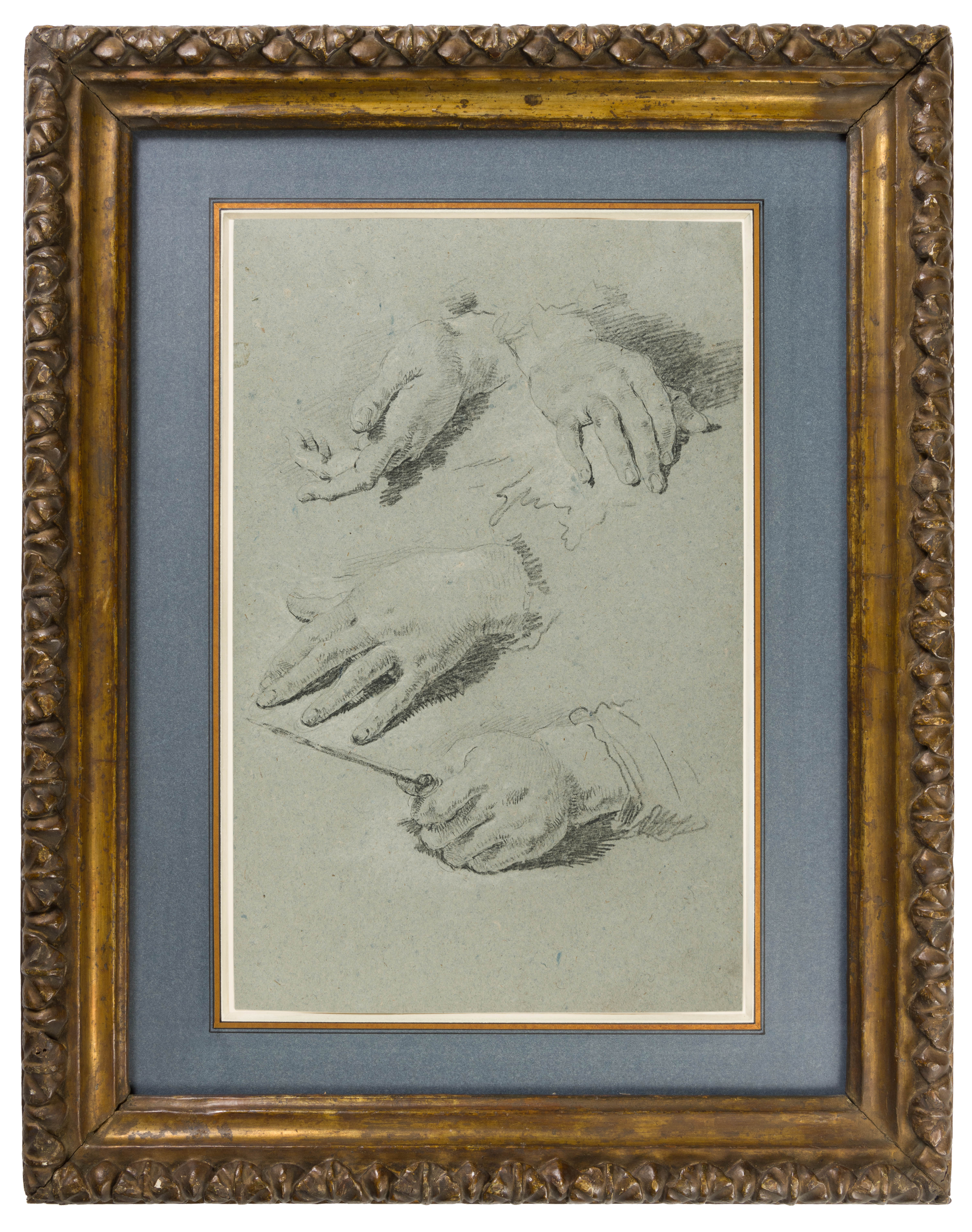This large sheet is likely to have been intended as a study for a painting - similar hands are found, for example, in Fontebasso’s genre painting of two young boys, in a private collection in Venice - or as a studio exercise, and it is interesting to note here how close Fontebasso’s style is here to the early chalk drawings of Giambattista Tiepolo. A closely related drawing of Four Studies of Hands, of similar technique and dimensions, was on the art market in 2005 and is today in an English private collection, while also comparable is a drawing of five hands formerly in the Italico Brass and Benjamin Sonnenberg collections and sold at auction in New York in 1979, and another sheet of studies of five hands that appeared at auction in Paris in 2019.