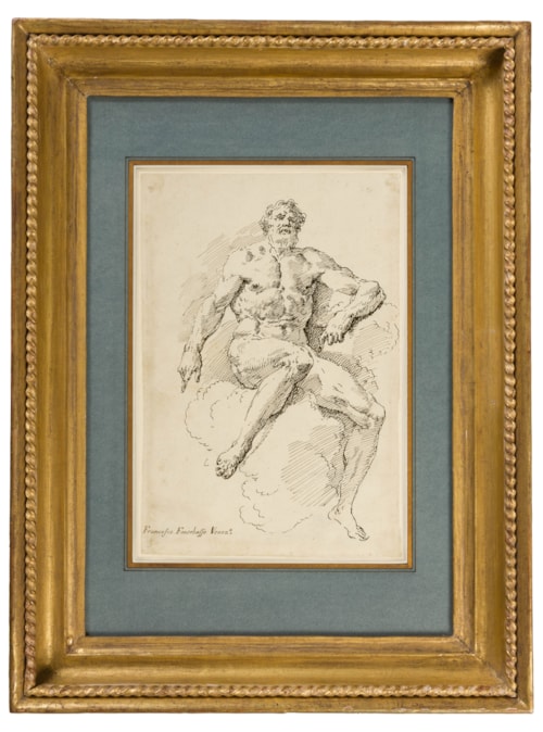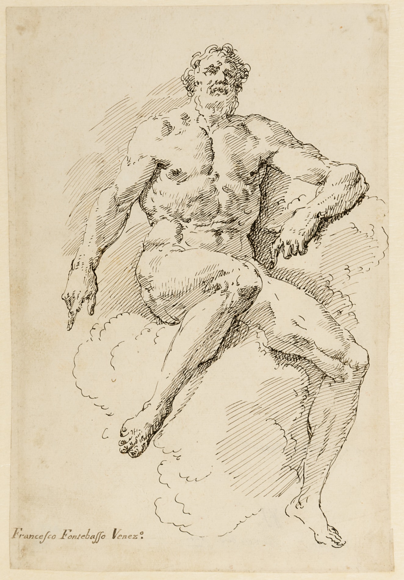 Drawn in a characteristic technique of pen and ink hatching, the present sheet is a fine example of Francesco Fontebasso’s confident draughtsmanship. A closely comparable pen study of a male nude seated on a cloud - part of an album of Fontebasso drawings which was broken up in the 1920s - was with the Venetian art dealer Pietro Scarpa in 1975. Among other stylistically similar pen and ink drawings by the artist is a study of Apollo that, like the present sheet, once belonged to the unknown collector known as the ‘Reliable Venetian Hand’ in the 18th century, and was later in the Byam Shaw and Wallraf collections before being sold at auction in 2001.