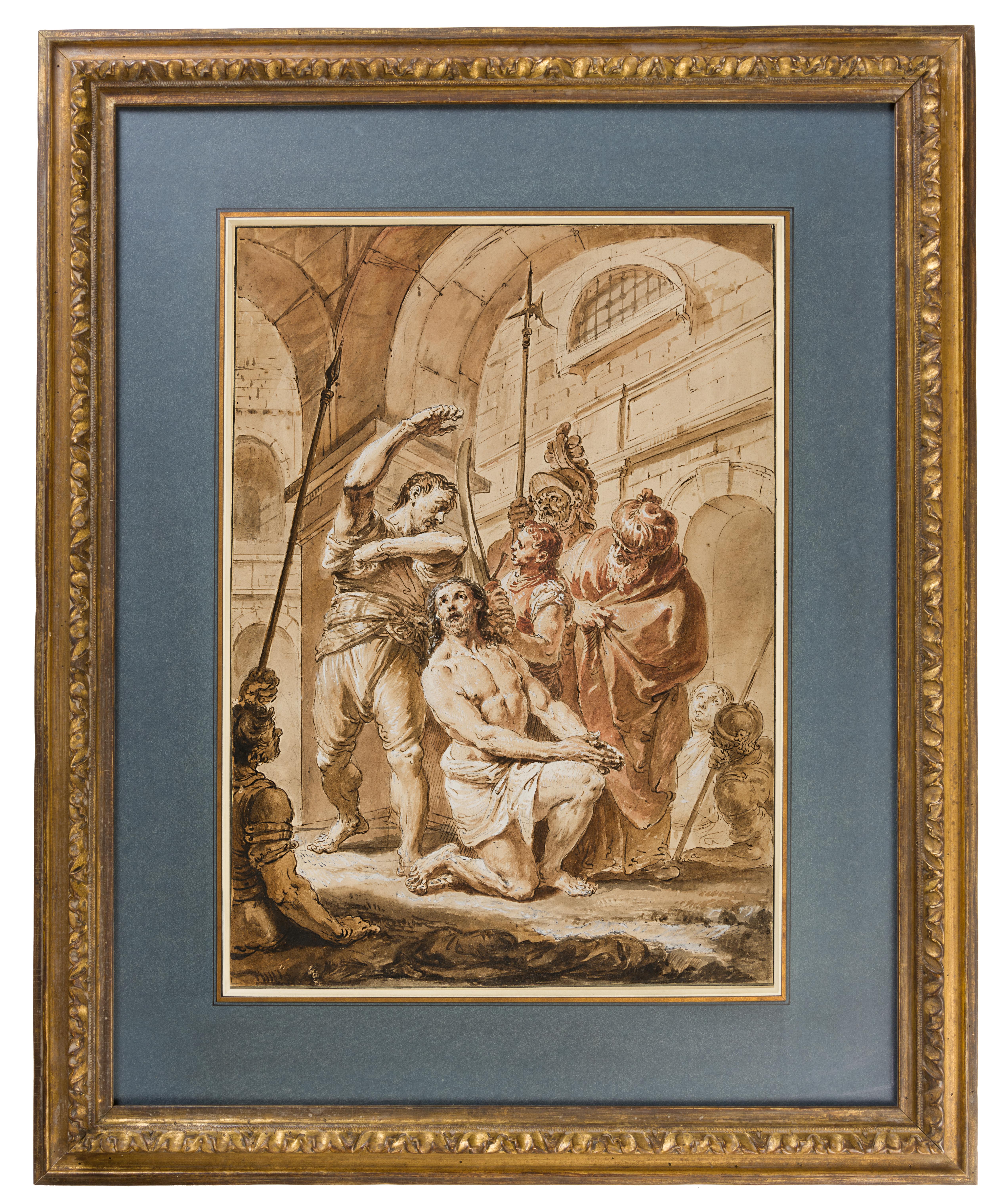 Drawings by Fontebasso of a similar subject, though different in composition, include a pen and ink sheet in the Galleria dell’Accademia in Venice and two related, large presentation drawings of the martyrdom of a male saint; one in a private collection in California and the other in the Ashmolean Museum in Oxford. Also similar in theme is a large sheet depicting The Beheading of a Male Saint, which is part of the album of Biblical drawings by Fontebasso in the Museo Correr in Venice.