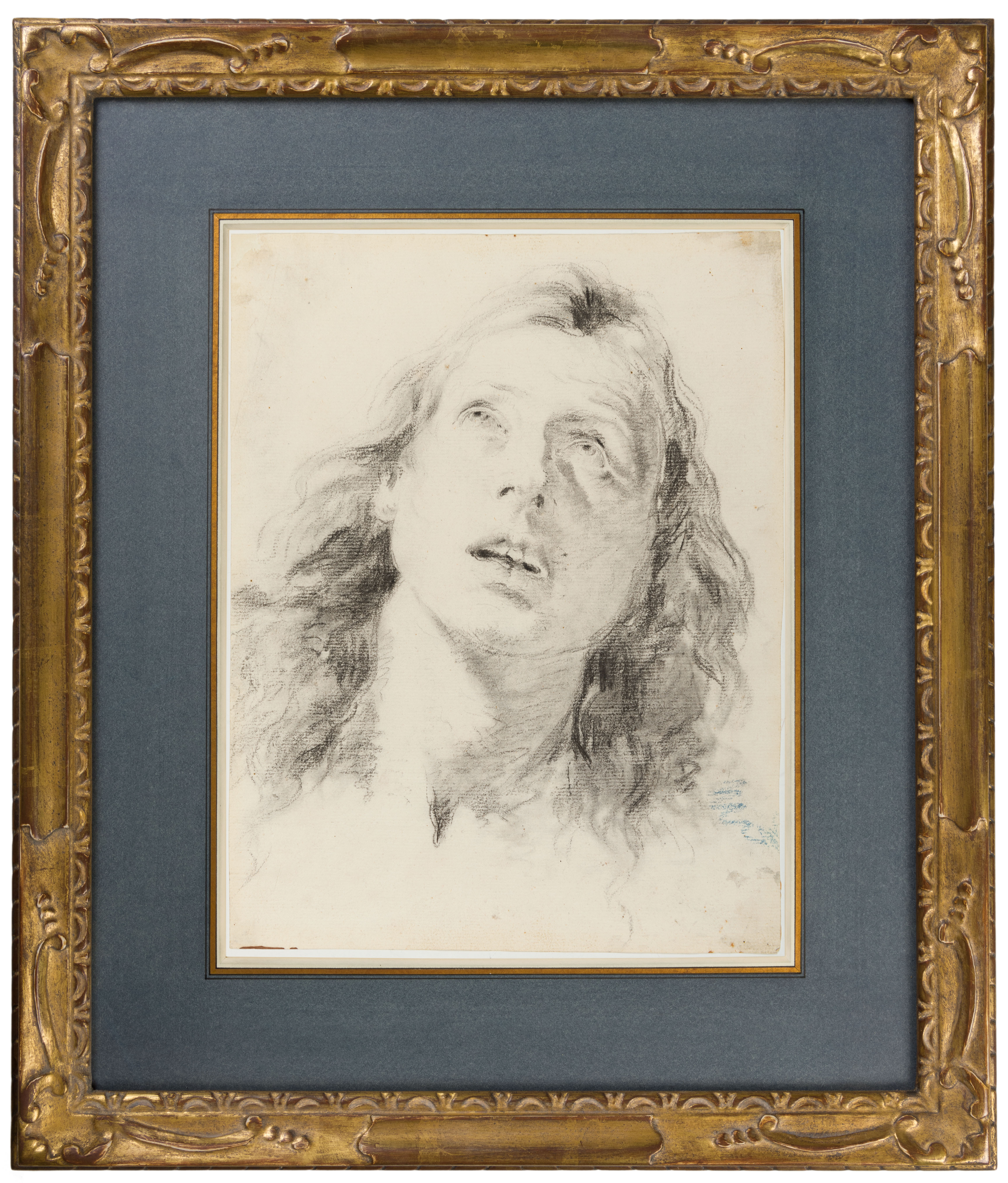 The head in the present sheet is derived from that of Saint Agatha from Giambattista Tiepolo’s altarpiece of The Martyrdom of Saint Agatha of c.1755, painted for the Benedictine convent church of Sant’Agata in Lendinara, near Rovigo, and now in the collection of the Gemäldegalerie in Berlin. (The painting was originally considerably taller, with an arched top, as can be seen in a reproductive etching by Domenico Tiepolo.) The intense facial expression of the dying saint was developed in a number of preparatory chalk drawings by Giambattista Tiepolo, and it is perhaps unsurprising that Lorenzo chose to study the same head in a free copy drawing of his own.