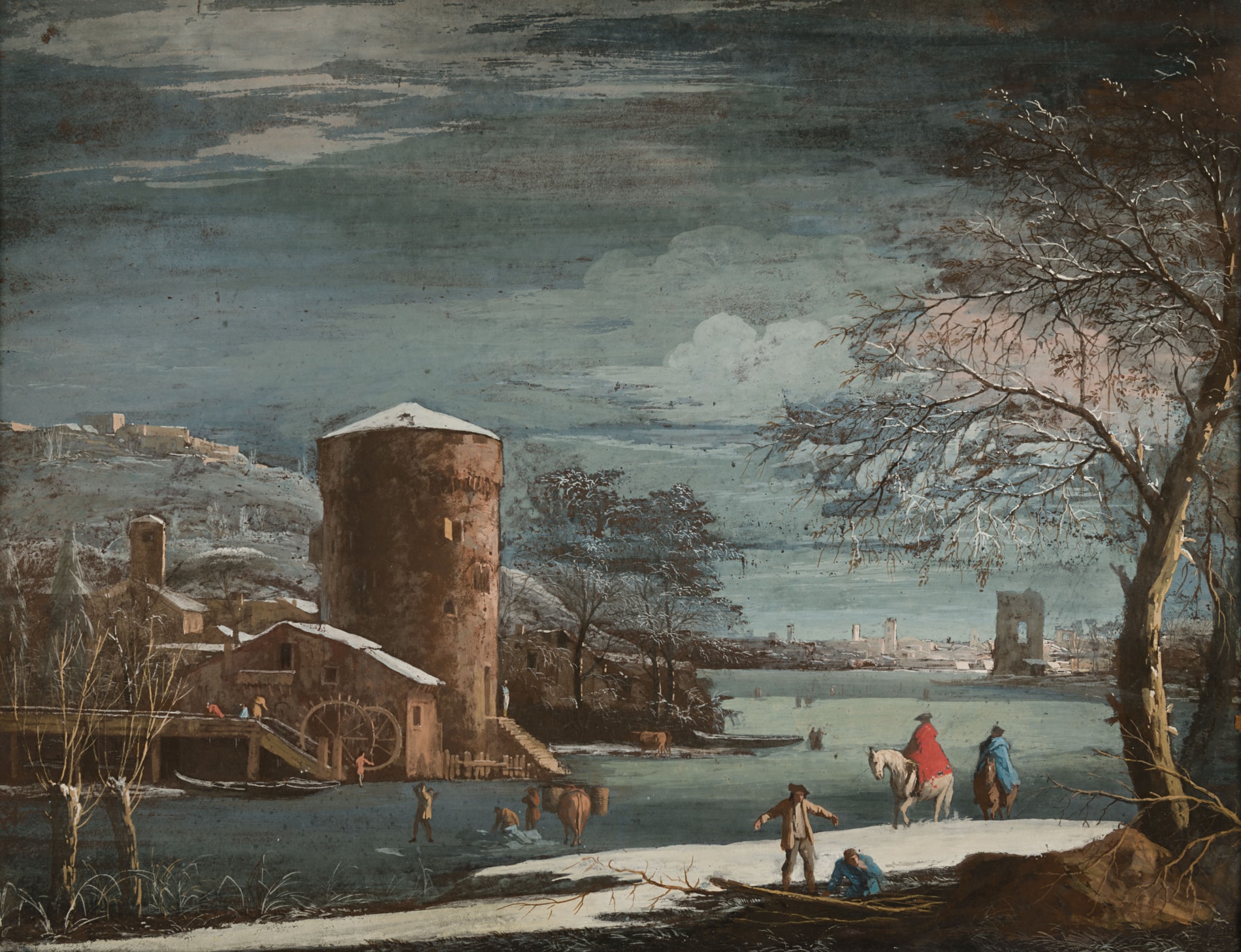 This atmospheric winter landscape is a particularly fine example of Ricci’s work in gouache. Winter subjects are uncommon in his oeuvre, although he must have experienced similar freezing conditions and snow in the region around his birthplace of Belluno in the Dolomites. He may likewise have been inspired by similar winter scenes among the 17th century Dutch landscapes that he could have studied in the collections of some of his patrons during his stay in London. (The artist may also have travelled through the Netherlands on his way between Venice and England.) As the Ricci scholar Annalisa Scarpa Sonino has noted of the artist’s rare winter subjects, ‘There is no attempt at embellishment or a capricious intervention in the effects of nature: winter, with its dried-up, snow-covered branches, leaden sky and frozen water, dominates the whole scene; and the meteorological ‘status’ portrayed is what Marco sees and feels in his constant, intimate contact with nature.’