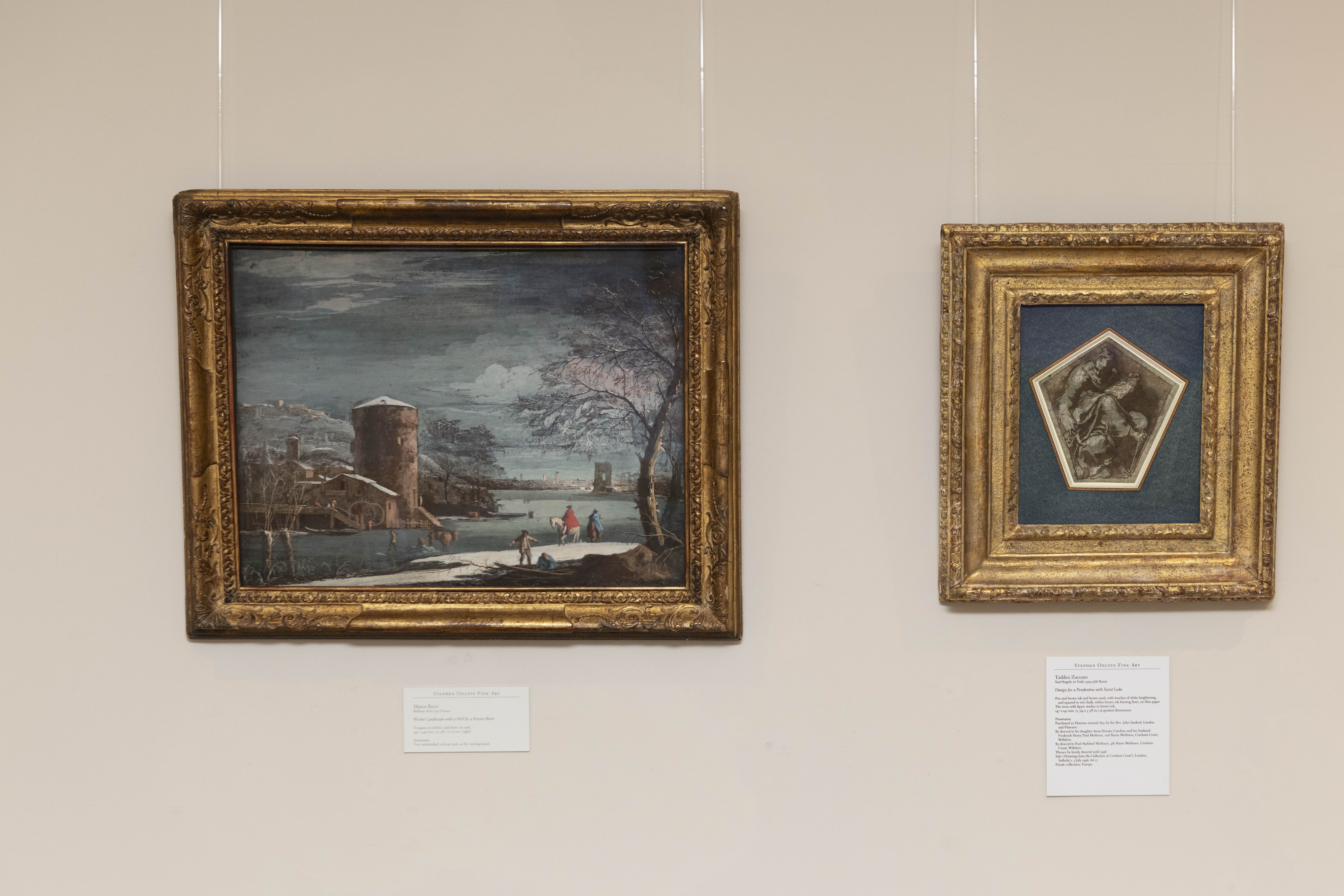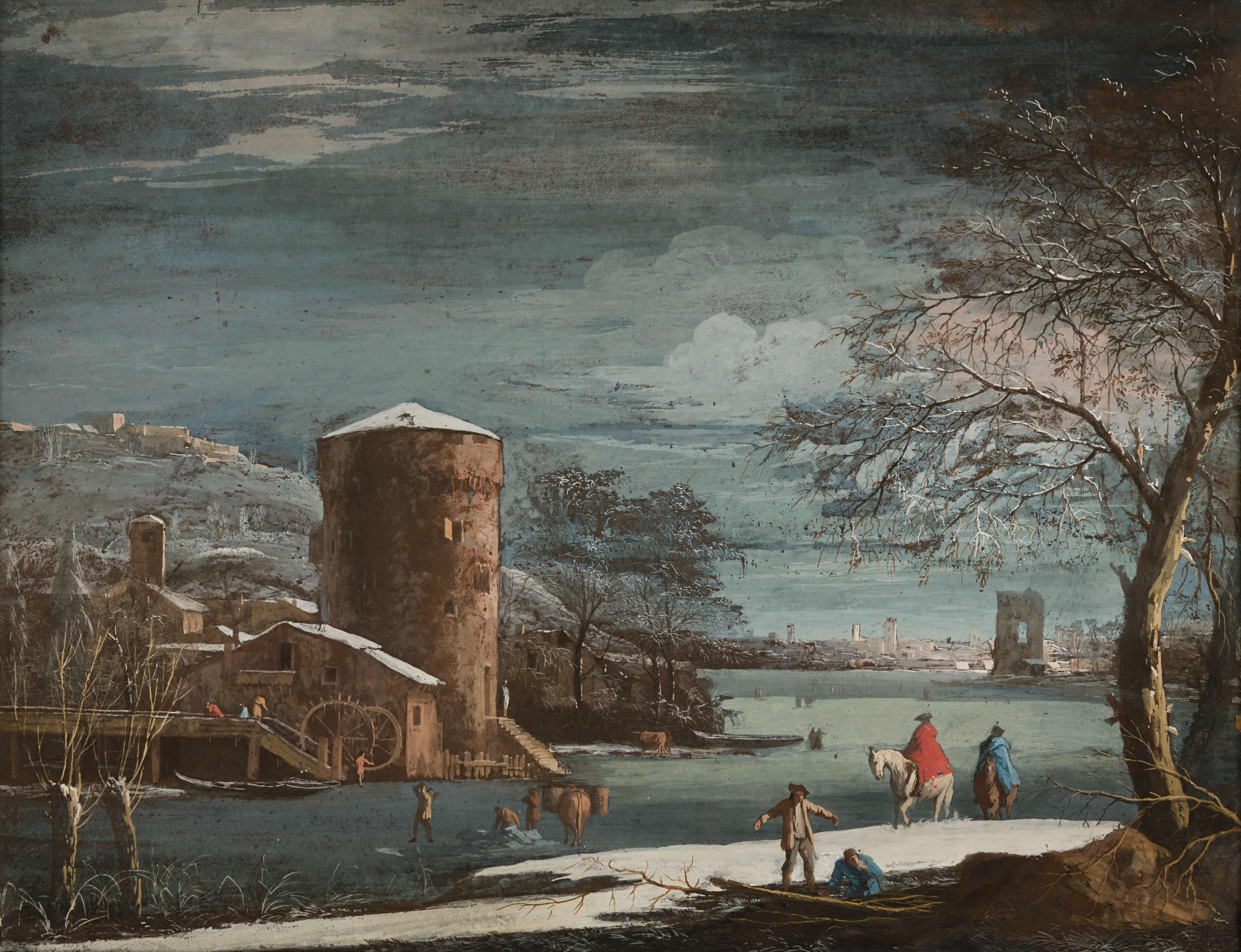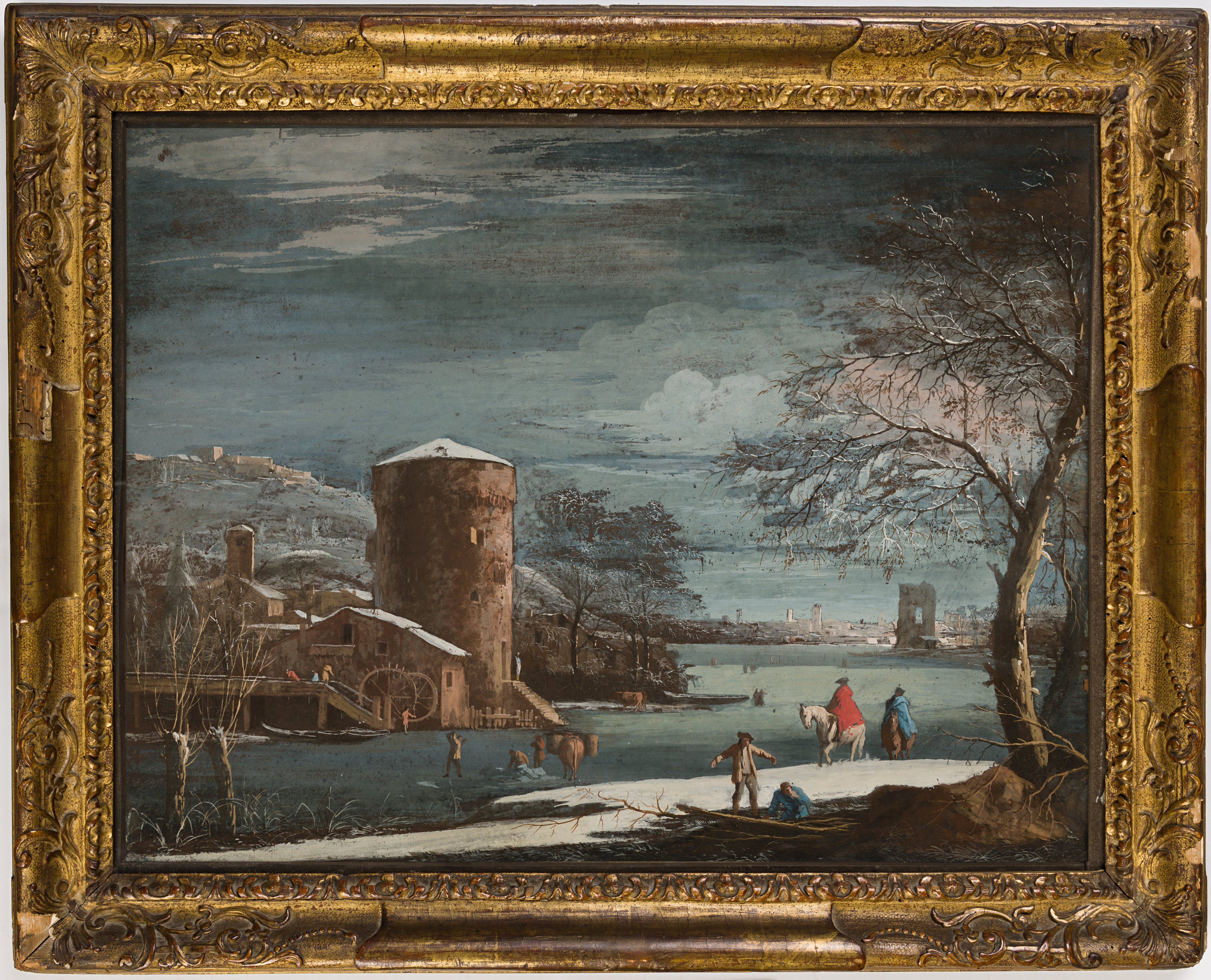This atmospheric winter landscape is a particularly fine example of Ricci’s work in gouache. Winter subjects are uncommon in his oeuvre, although he must have experienced similar freezing conditions and snow in the region around his birthplace of Belluno in the Dolomites. He may likewise have been inspired by similar winter scenes among the 17th century Dutch landscapes that he could have studied in the collections of some of his patrons during his stay in London. (The artist may also have travelled through the Netherlands on his way between Venice and England.) As the Ricci scholar Annalisa Scarpa Sonino has noted of the artist’s rare winter subjects, ‘There is no attempt at embellishment or a capricious intervention in the effects of nature: winter, with its dried-up, snow-covered branches, leaden sky and frozen water, dominates the whole scene; and the meteorological ‘status’ portrayed is what Marco sees and feels in his constant, intimate contact with nature.’