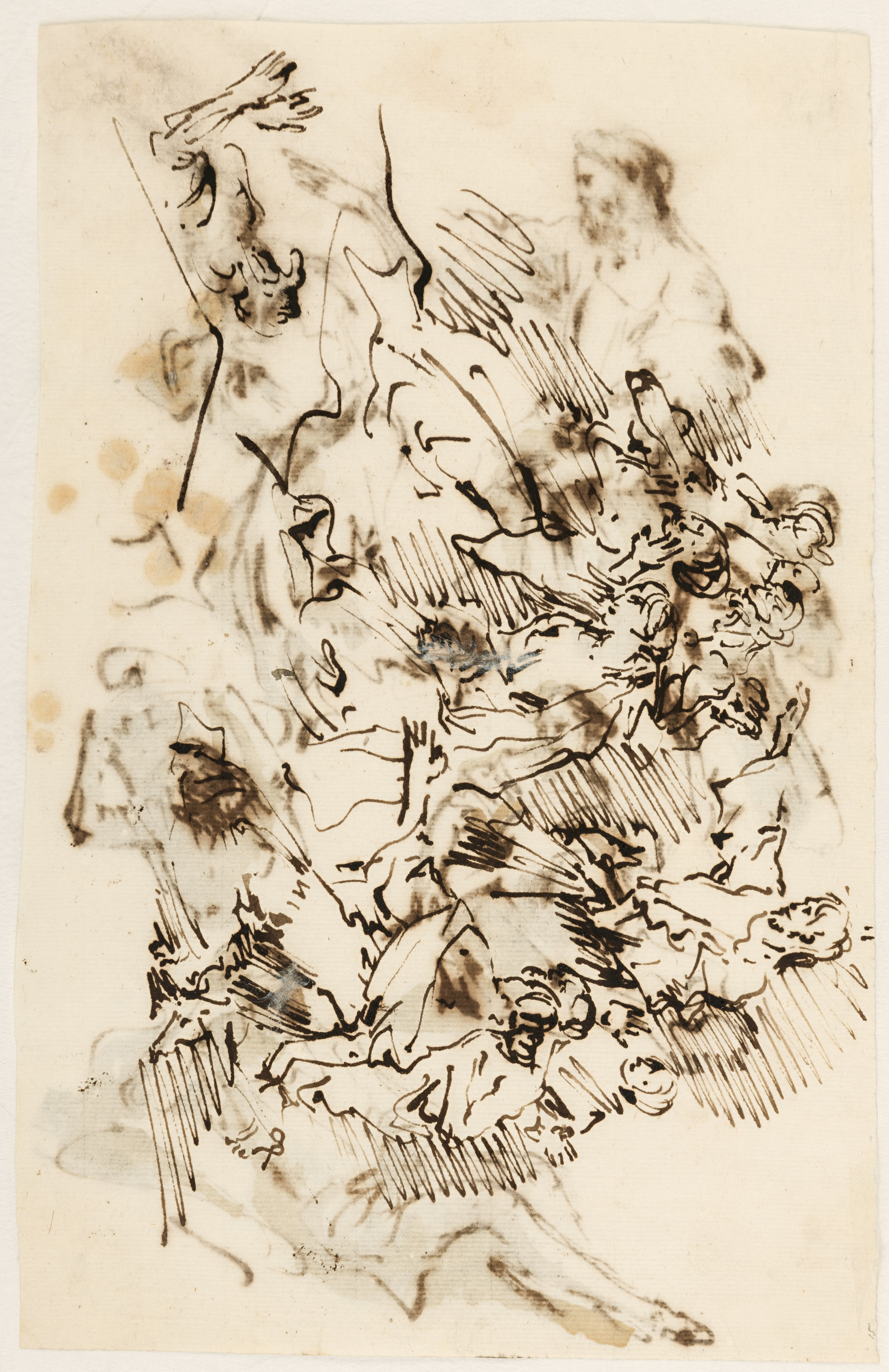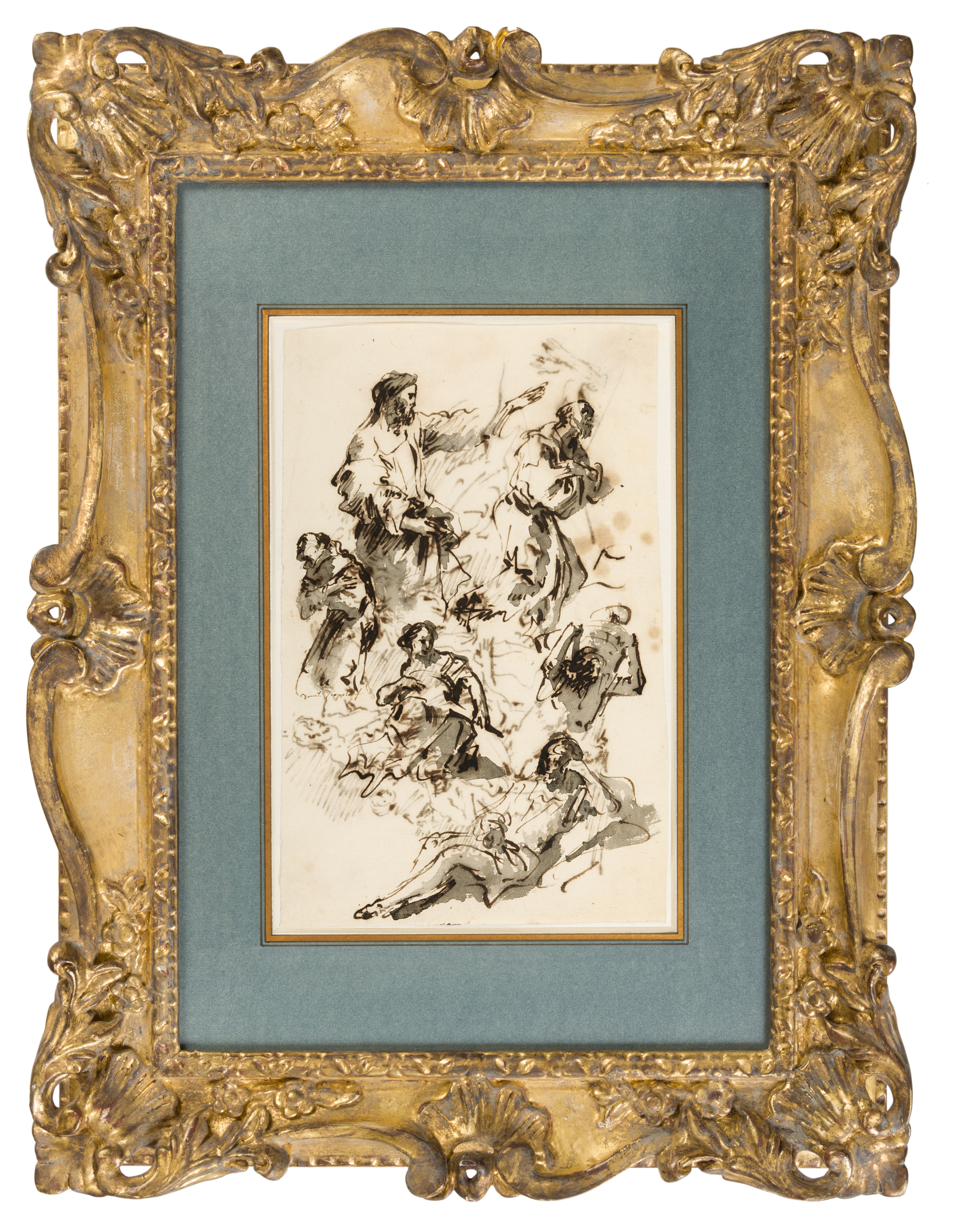 The drawing on the verso of the sheet is a free copy, in reverse, of the composition of a brush drawing of The Raising of Lazarus by the 17th century Genoese artist Giovanni Benedetto Castiglione (1609-1664), which is today in the Royal Collection at Windsor Castle. The pointing figure of Christ on the recto of the present sheet is likewise derived from the same figure in Castiglione’s drawing, which was part of a group of drawings by the artist, bound into four volumes, that belonged to the Sagredo family in Venice in the 18th century. (The albums later passed into the collection of Joseph Smith, the British Consul in Venice, who sold them with the rest of his collection to King George III in 1762.) Although Domenico Tiepolo may have had access to the Sagredo volumes of drawings by Castiglione before they left for England in 1762, it is perhaps more likely that this drawing was based on Castiglione’s reversed monotype of the same composition. Domenico is known to have owned several prints by Castiglione, and both he and his father copied motifs from the Genoese artist’s prints in their drawings.