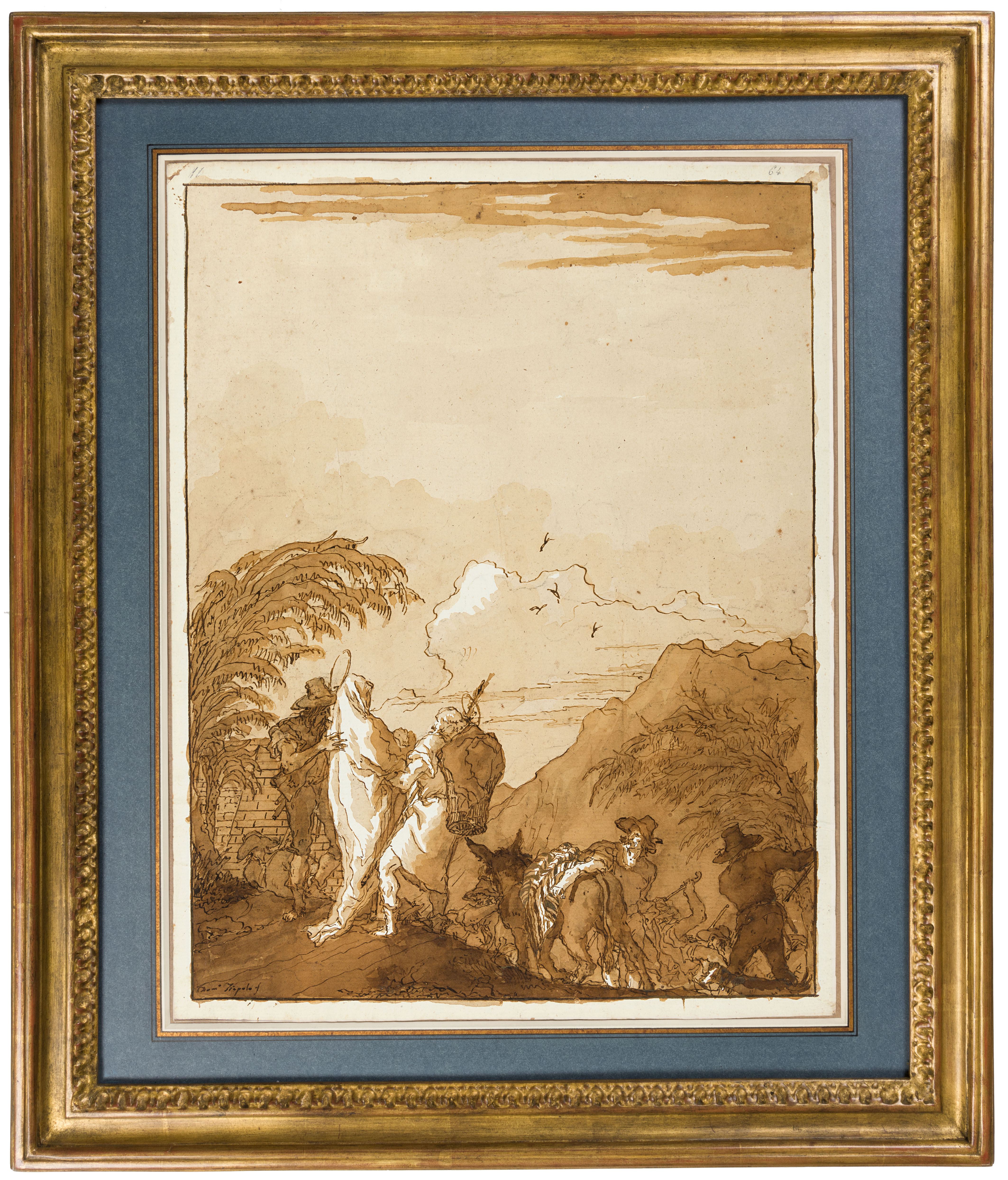 Long held in a French private collection and never before exhibited, this large drawing of The Holy Family Meet the Robbers is a previously little-known example from Domenico Tiepolo’s‘Large Biblical Series’. The subject is taken from the so-called ‘Arabic Gospel’ or ‘Syriac Infancy Gospel’; a compilation of apocryphal stories about the infancy of Jesus, derived from a now-lost Syriac manuscript of the 5th or 6th century that became known to Western audiences after being published in an Arabic and Latin translation in the late 17th century. The present sheet depicts the obscure story of the Holy Family’s encounter with robbers during their Flight into Egypt, as recounted in the ‘Arabic Gospel’:
