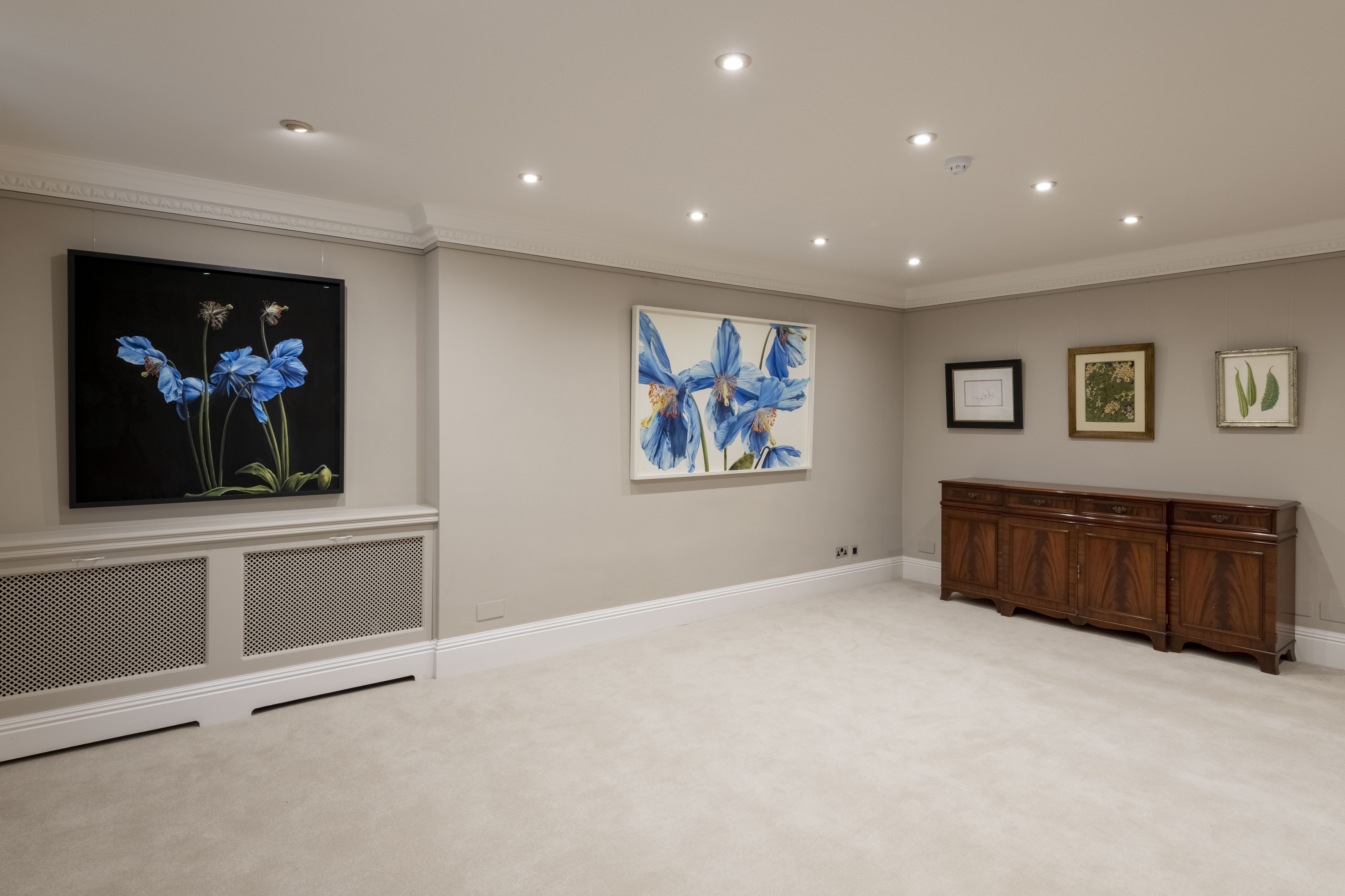 Of this large watercolour, the artist has written: ‘The Poppy - it grows in the harshest of environments. It is the flower of dreams, of fate, of escape, of seduction, intoxication, transformation, transcendence, of fertility, death and of survival against all odds. For me, the Himalayan Poppy has an almost unnatural blueness about it which makes it even more otherworldly. I found these poppies in Cluny Gardens in Perthshire on an expedition trip back in 2018. Poppies in black space are about hiding and not being seen properly. Of having to flower in the darkness. As with a lot of my paintings, there’s a ‘doublet’ - two flower heads that have lost their petals. They stand there naked, slightly deformed, with a skirt of anthers, not really looking at one another. The piece is about the distance between lovers and hidden hope.’