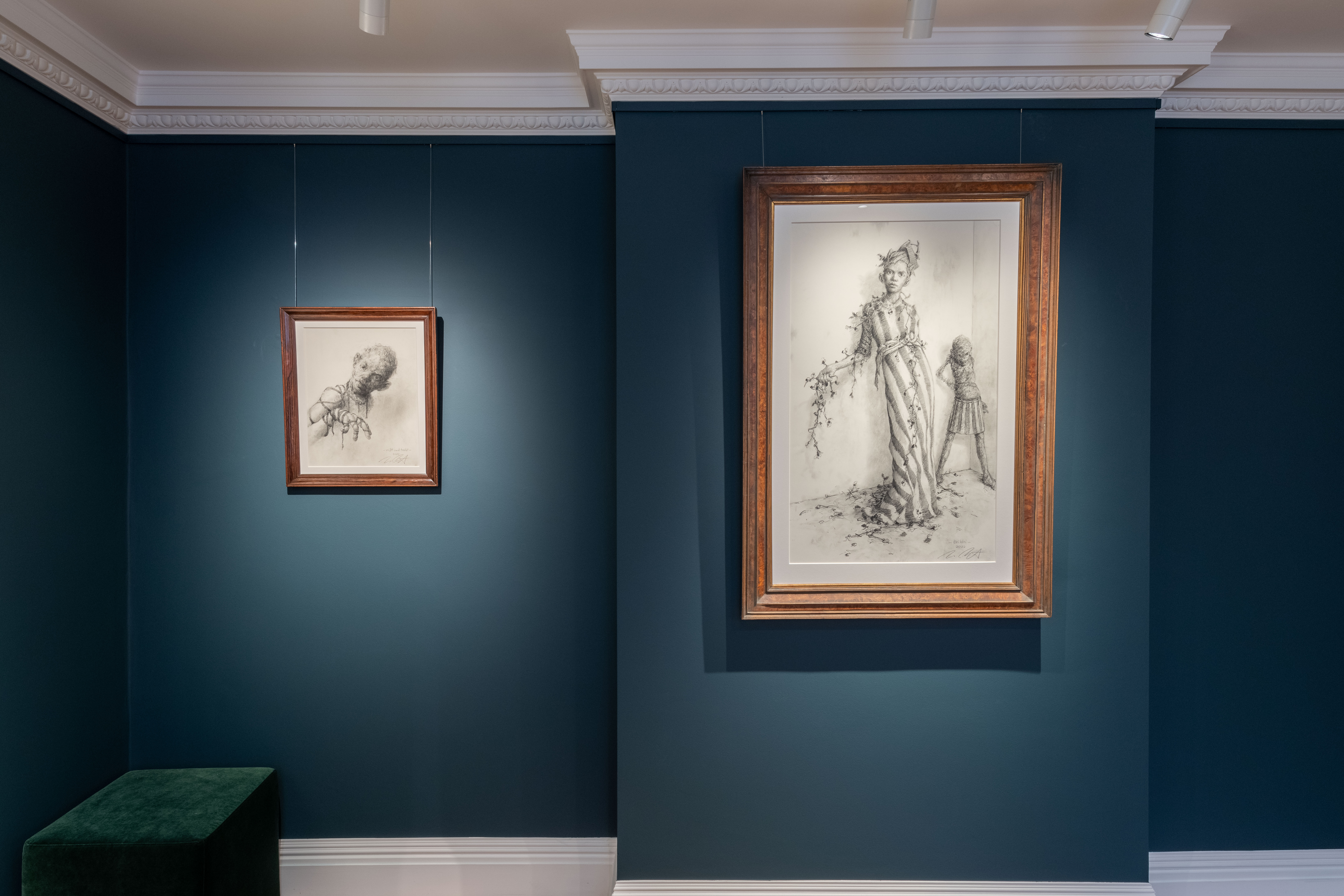 Although Burgert is known predominantly for intensely coloured, life-size figurative paintings, often on a very large scale, his drawings reveal the intricacy of the artist’s character studies in black and white. Densely populated tableaux are how Burgert explores non-linear storytelling. Often created at the same time as these expansive pictorial dramas, the subjects of his individual portraits are exiles from the main story, isolated within their own frame. Untethered from a central narrative, they become newly enigmatic, each alluding to its own particular mysteries. Burgert is interested in the personification of psychology through figurative painting and it is his ongoing close observation of human emotion that gives his characters such a potent charge. As one writer and curator has commented, ‘[Burgert] primarily works on large-scale paintings inhabited by objects, animals, people and whimsical entities that disintegrate and constantly mutate. Tiny people and gigantic creatures spill out of cracks, perish between petals or sink into dull sheets; scraps of clothing without bodies to wear them; eyes staring into the void. Burgert’s paintings elude straightforward interpretation, they explore a higher reality and invoke the end of the world through personalities with multiple inner lives…A constant need to portray hope and failure, beauty and confusion, prevails. Through his paintings, the artist strives to create spaces dedicated to the spiritual representation of ourselves – so that the observer is transformed into a creature, a figure within this painted reality...Jonas Burgert’s work is dominated by restlessness, it abounds in imagination while conveying authentic inner realities and energy.’