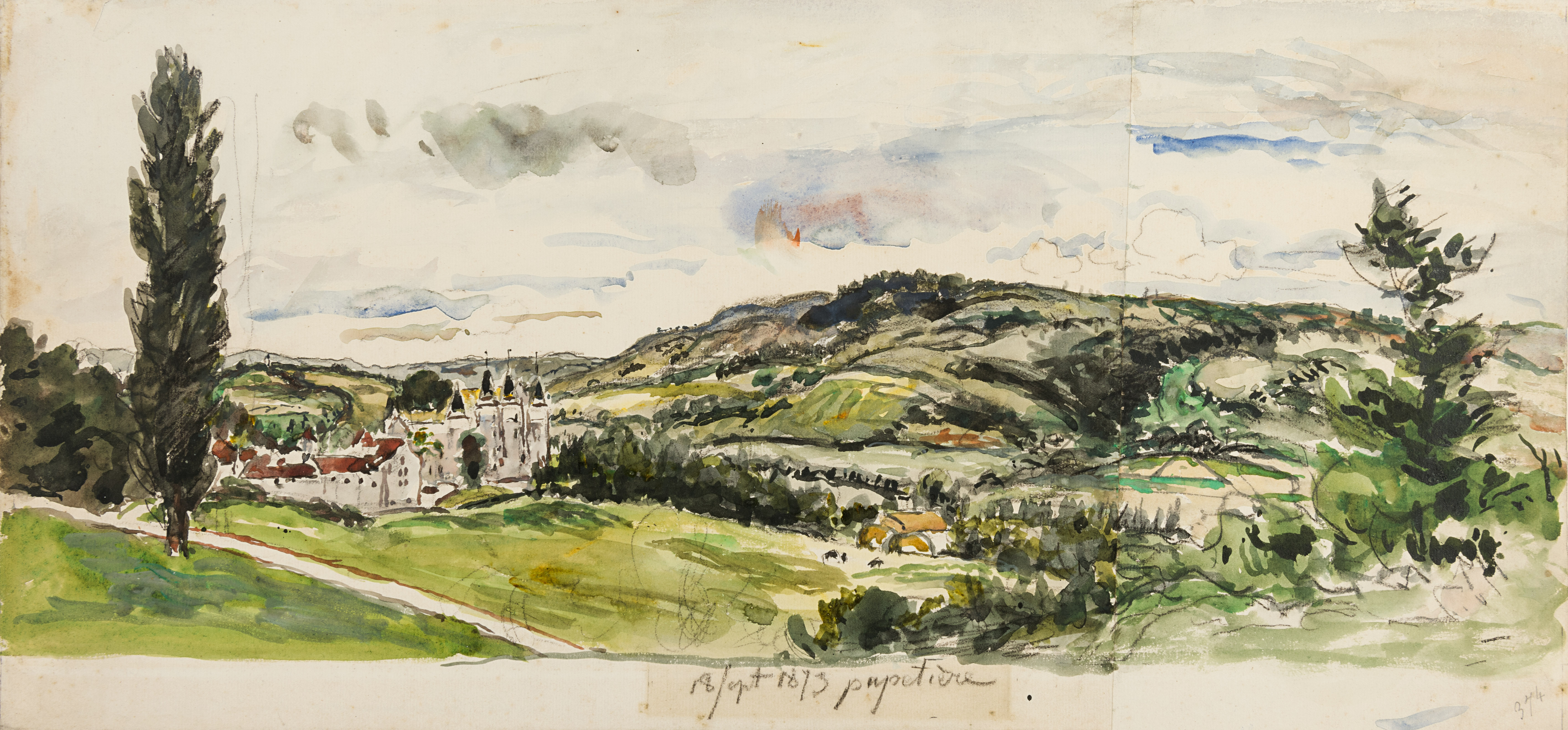 Among comparable watercolour views of the landscape with the château of Pupetières in the distance is one dated 17 August 1874, in a private collection, and two others, dated 13th and 29th August 1875, in the Musée d’Orsay in Paris. A later watercolour of the château and its surroundings, dated 14 August 1877, is in another private collection. The artist does not seem to have produced any painted views of Pupetières, however.