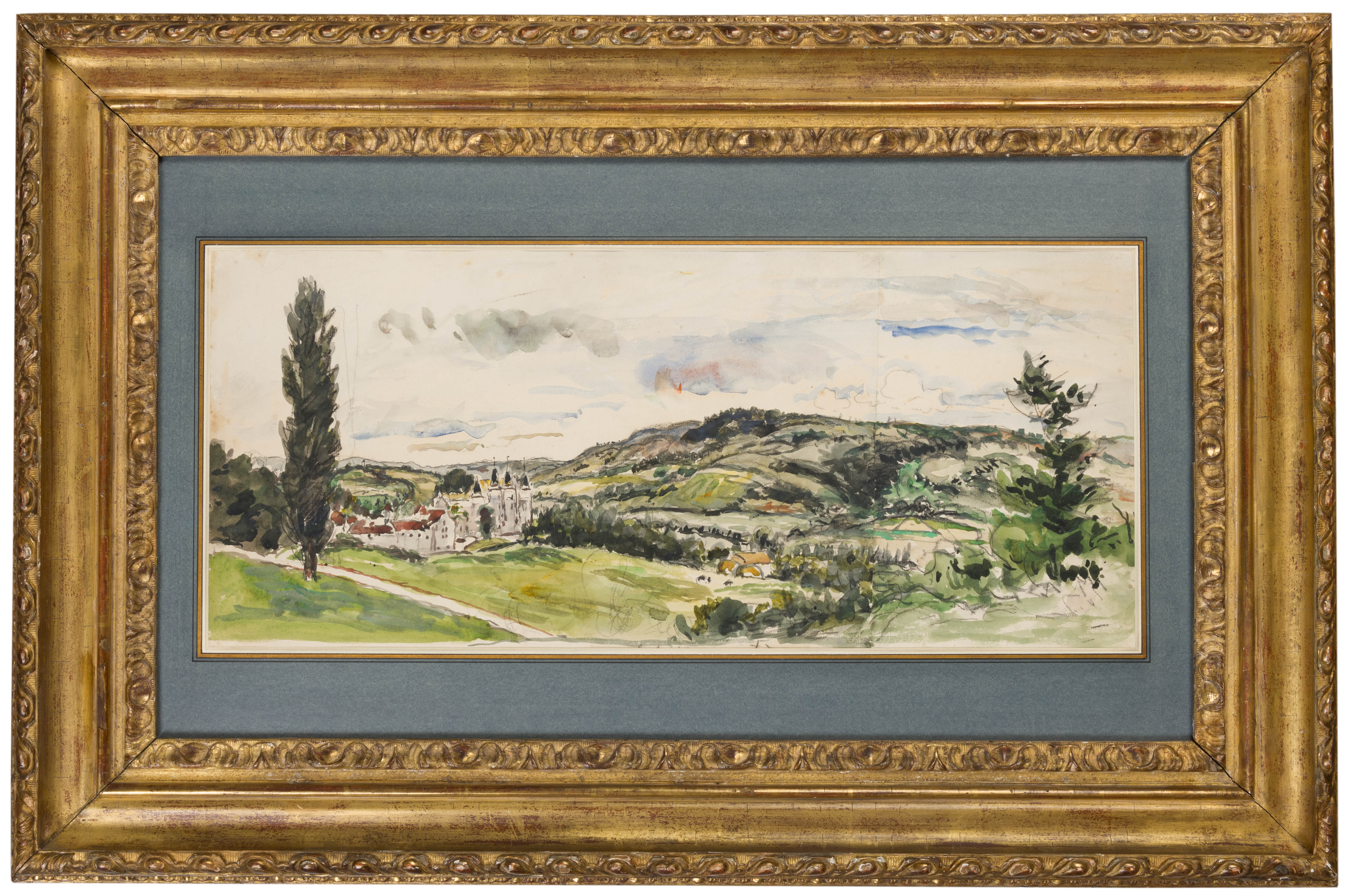 Drawn on the 18th of September 1873, the present sheet is an exceptionally large and fresh example of Jongkind’s watercolour technique. During the 1870s in particular, the artist tended to prefer an extended horizontal format for his watercolours, often using a double-page spread of a rectangular sketchbook. The scene depicted here is a view of the 19th century château of Pupetières, close to Châbons in the valley of the river Bourbre, in the Dauphiné region of France. Jongkind first came to the area, with his companion Joséphine Fesser, in the autumn of 1873, when this watercolour was made. They visited Joséphine’s son Jules, who was working as a chef at the château, which had been rebuilt in a neo-gothic style by the architect Eugène Viollet-le-Duc in the early 1860s. Jongkind fell in love with the landscape of the Dauphiné, and they returned to the area every summer thereafter. In 1878 Jules Fesser bought a home in the nearby town of La Côte-Saint-André, where Jongkind and Joséphine spent much time, and where the artist is buried.