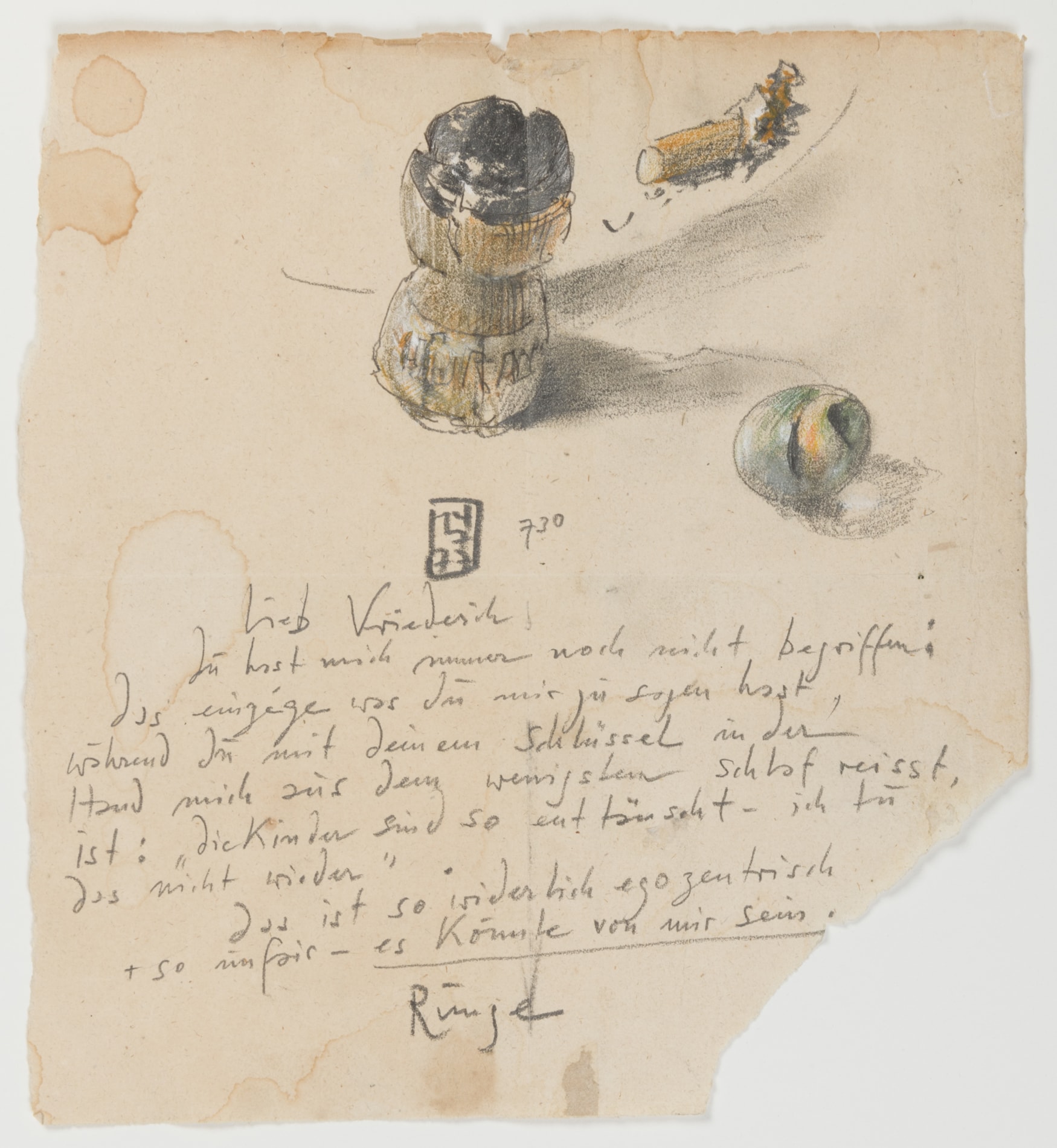 Dated and inscribed 14 / 7 / 77 730 / Lieb Vriederich / du hast mich immer noch nicht begriffen: / das einzigewas du mir zu sagen hast, / während du mit deinem Schlüssel in der / Hand mich aus dem wenigsten schlaf reisst, / ist: “die Kinder sind so enttäuscht – ich tu / das nicht wieder”. / das ist so widerlich egozentrisch / + so unfair – es Könnte von mir sein. / Runge. at the bottom half of the sheet.