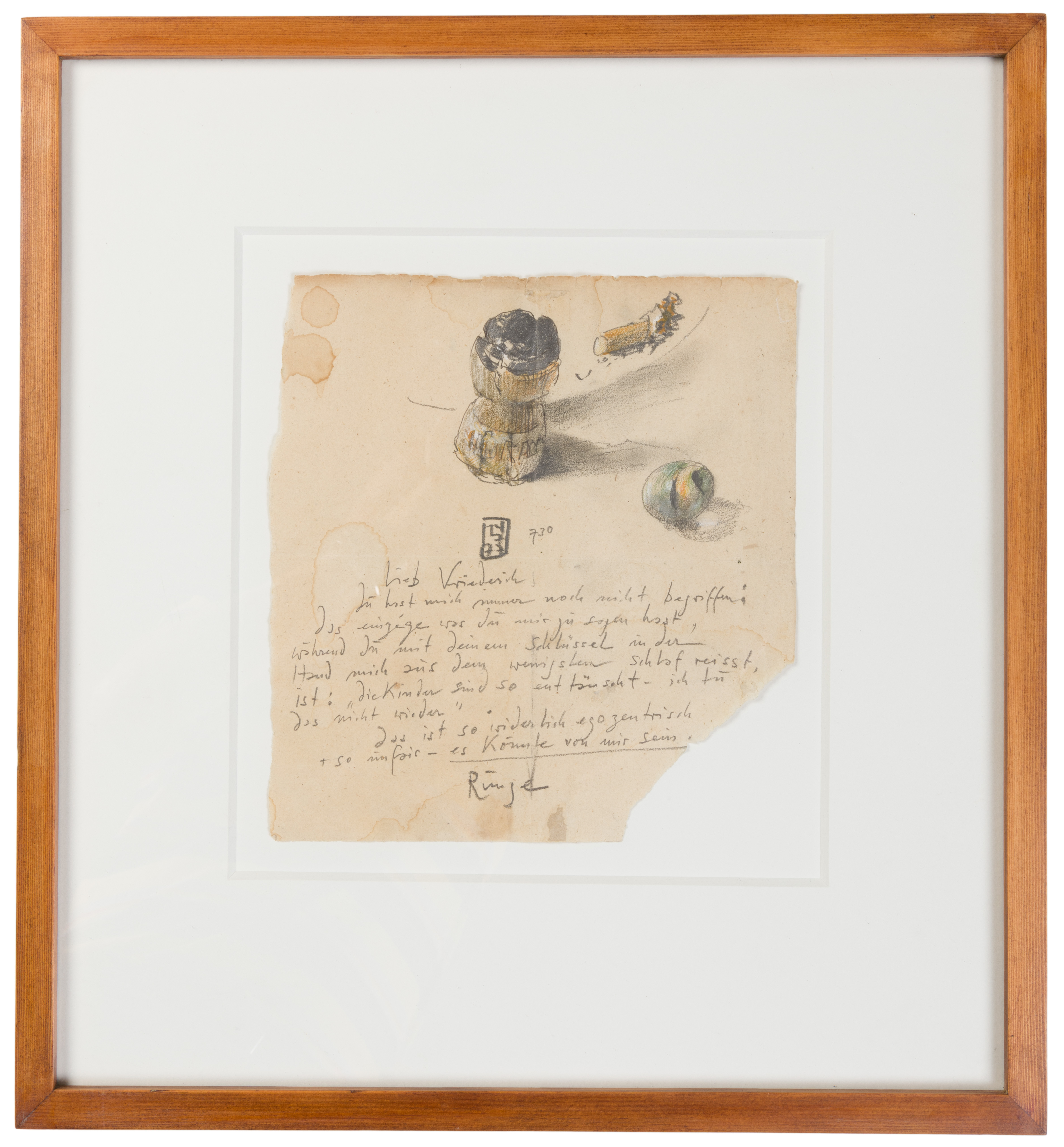 Horst Janssen’s love affair with Viola Rackow (b.1941) resulted in a long friendship and correspondence, with the artist sending her numerous illustrated letters. In many of these letters, such as the present sheet, the artist addresses Viola as ‘Vriederich’ or ‘Vriedrich’ and signs himself as ‘Runge’. This stems from the fact that Janssen often went to see the important group of paintings by the German Romantic artists Philipp Otto Runge and Caspar David Friedrich in the collection of the Kunsthalle in Hamburg. His obsession with these works resulted in Viola’s once jokingly referring to him as ‘Runge’, to which Janssen responded by calling her ‘Vriederich’ (with a V for Viola instead of an F), and it seems that both nicknames stuck.