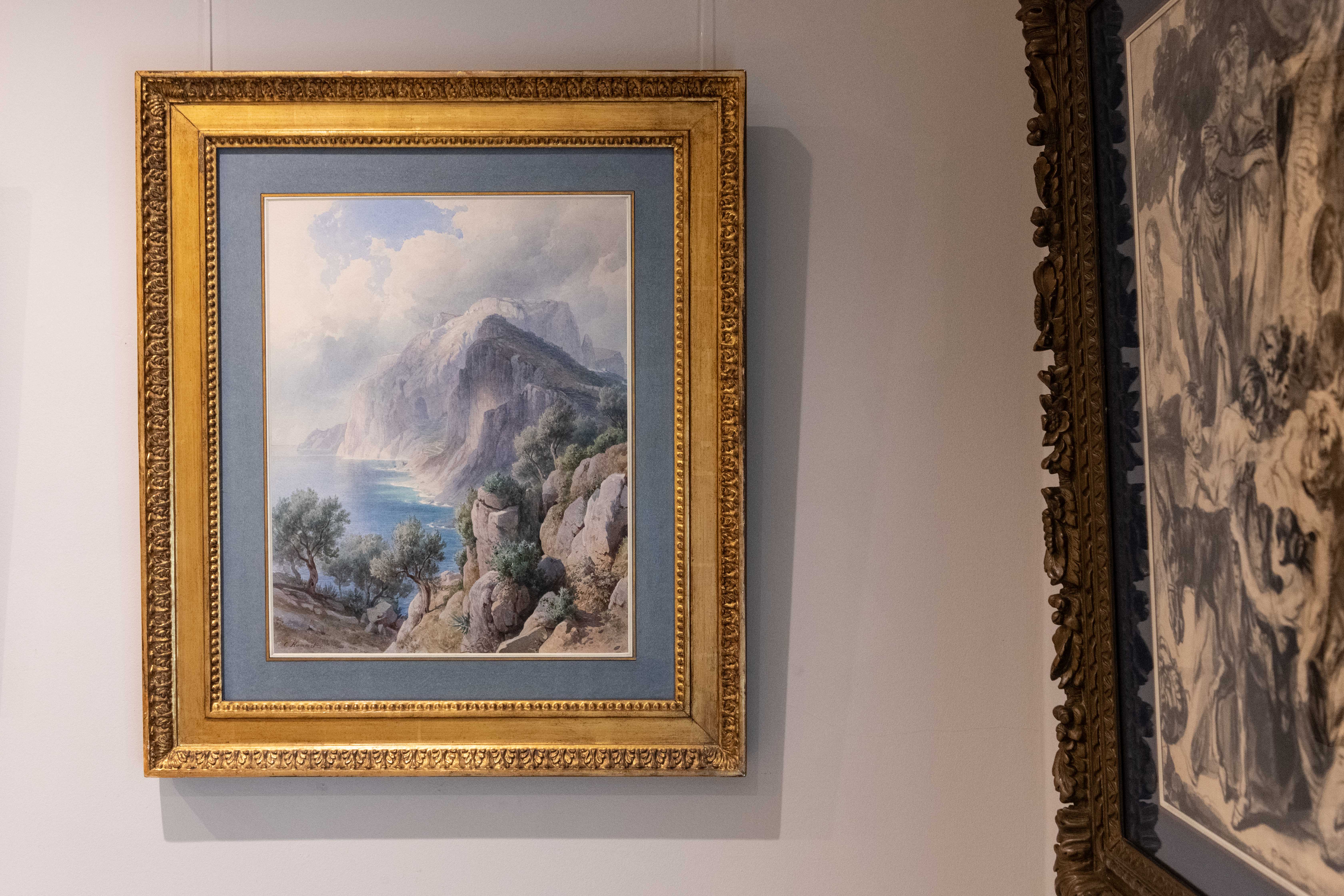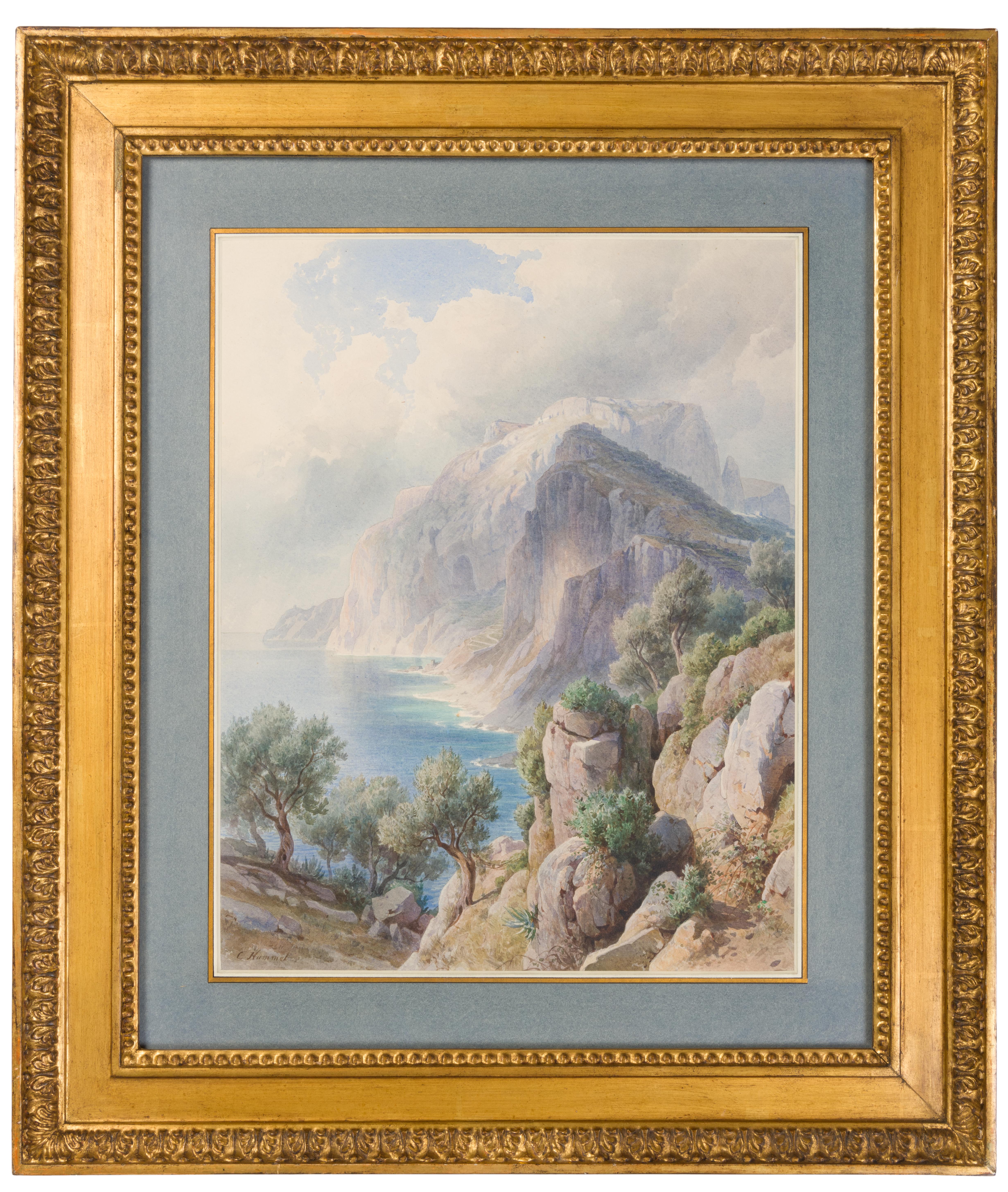 Datable to between 1842 and 1846, when Carl Hummel travelled throughout Italy, this fine watercolour depicts part of the southern coast of the island of Capri. In the foreground is a rocky outcrop with the castle-like Villa Castiglione at its summit, while behind rises Monte Solaro, the highest point on the island at 589 metres above sea level. In the valley between the mountains can be seen the winding paved footpath known as the Via Krupp, leading down to the small fishing village of Marina Piccola.
