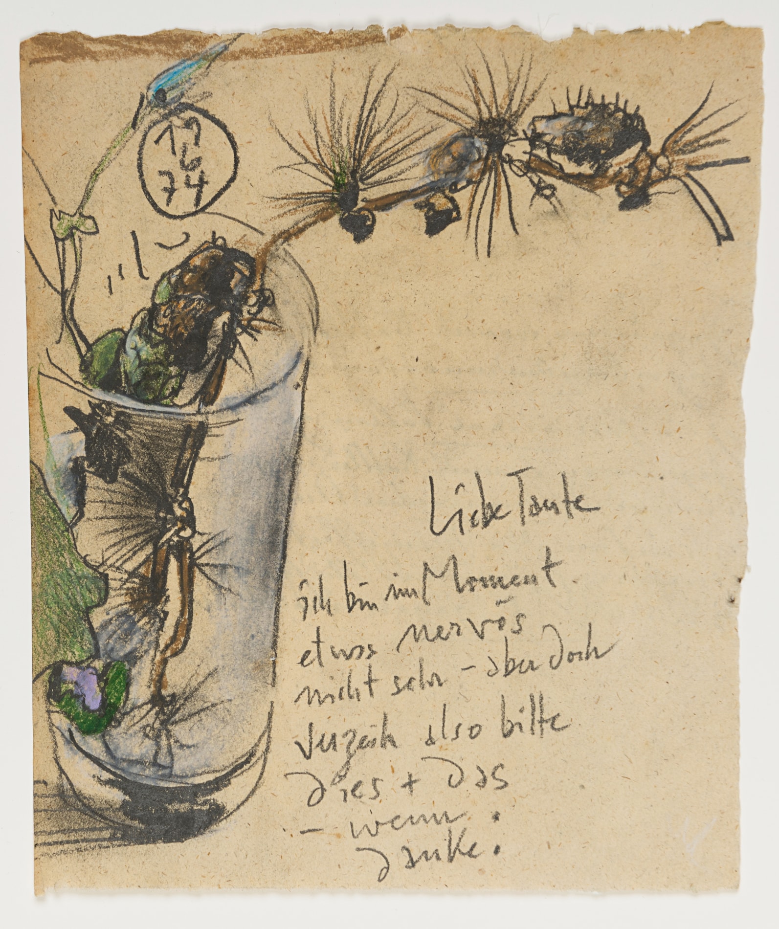 Dated 19/6/74 at the upper left, and extensively inscribed Liebe Tante / ich bin im Moment / etwas nervös / nicht sehr - aber doch / verzeih also bitte / dies + das / - wenn / danke. at the lower centre.