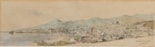 This extensive watercolour view of the city of Naples from the east is likely to date from the beginning of the 1850s, when Eduard Hildebrandt travelled through Italy on his way to Greece, Turkey and Egypt. The scene depicts the Castel dell’Ovo at the extreme left of the composition, with the Castel Sant’Elmo on the hill at the centre right.