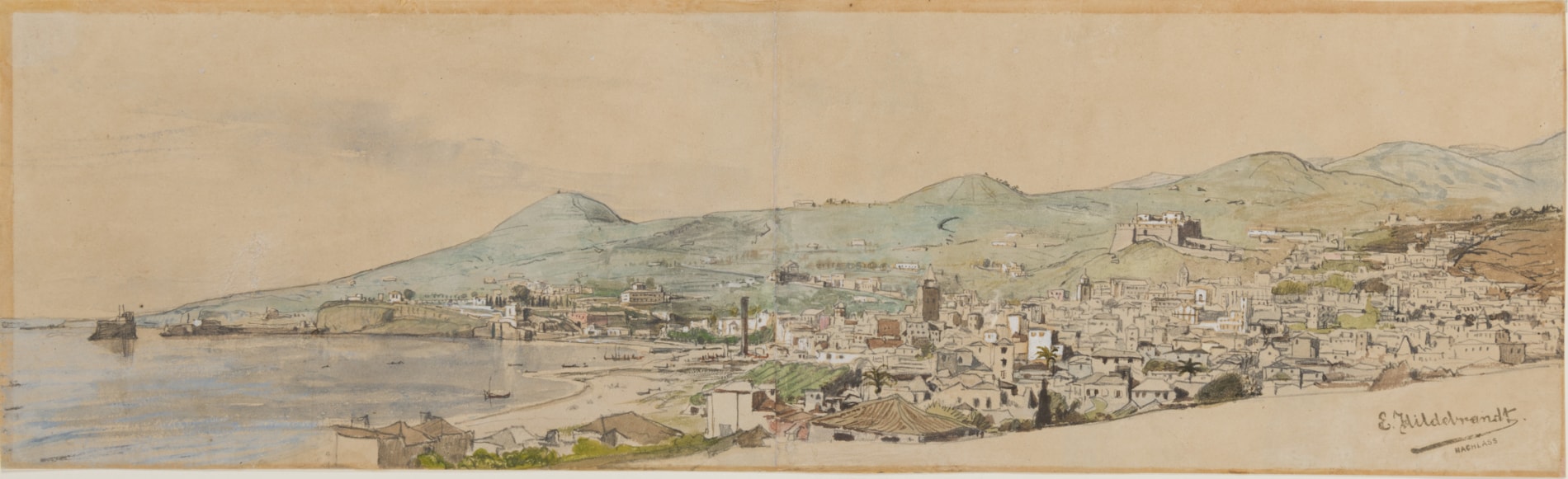 One of the most well-travelled artists of his day, Hildebrandt journeyed throughout Europe, Scandinavia and the Near East, as well as Brazil, Mexico and the east and west coasts of America. Between 1862 and 1864 he undertook a long voyage to India, Ceylon, Japan, the Philippines and China, producing several hundred drawings and watercolours. An exhibition of his watercolours from this journey, held on the Boulevard des Italiens in Paris in 1866, took the form of illuminated dioramas. This novel method of displaying the works led one French critic to note that ‘It is marvellous to see what these images, already so faithful to nature, gain in truth, in strength, in brilliance. The streets of Hong Kong and Peking, the theatres of Macau, the gulf of Nagasaki, illuminated by artificial light, take on a surprising value, one feels a fiery sun…’ The exhibition later travelled to London, where it was shown on Pall Mall. Between 1867 and 1870 Hildebrandt published an illustrated journal entitled Reise um die Erde, or Journey Around the World, in three volumes. A large number of the artist’s topographical views and figure studies are today in the collection of the Kupferstichkabinett in Berlin, from which an exhibition of drawings and watercolours was held in 1959.