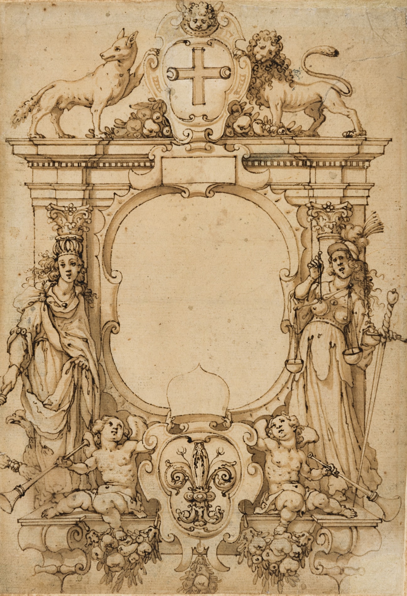 This fine sheet is possibly the work of an artist in the circle of the Italo-Dutch painter Friedrich Sustris (c.1540-1599), and one who had perhaps travelled and worked in Italy. The Florentine giglio – the lily of the coat of arms of the city of Florence – at the bottom of the composition suggests a Tuscan connection, while an ecclesiastical element is indicated by the bishop’s mitre above the lily. The fact that the outlines are partly indented with a stylus suggests that this drawing is a design for a print.