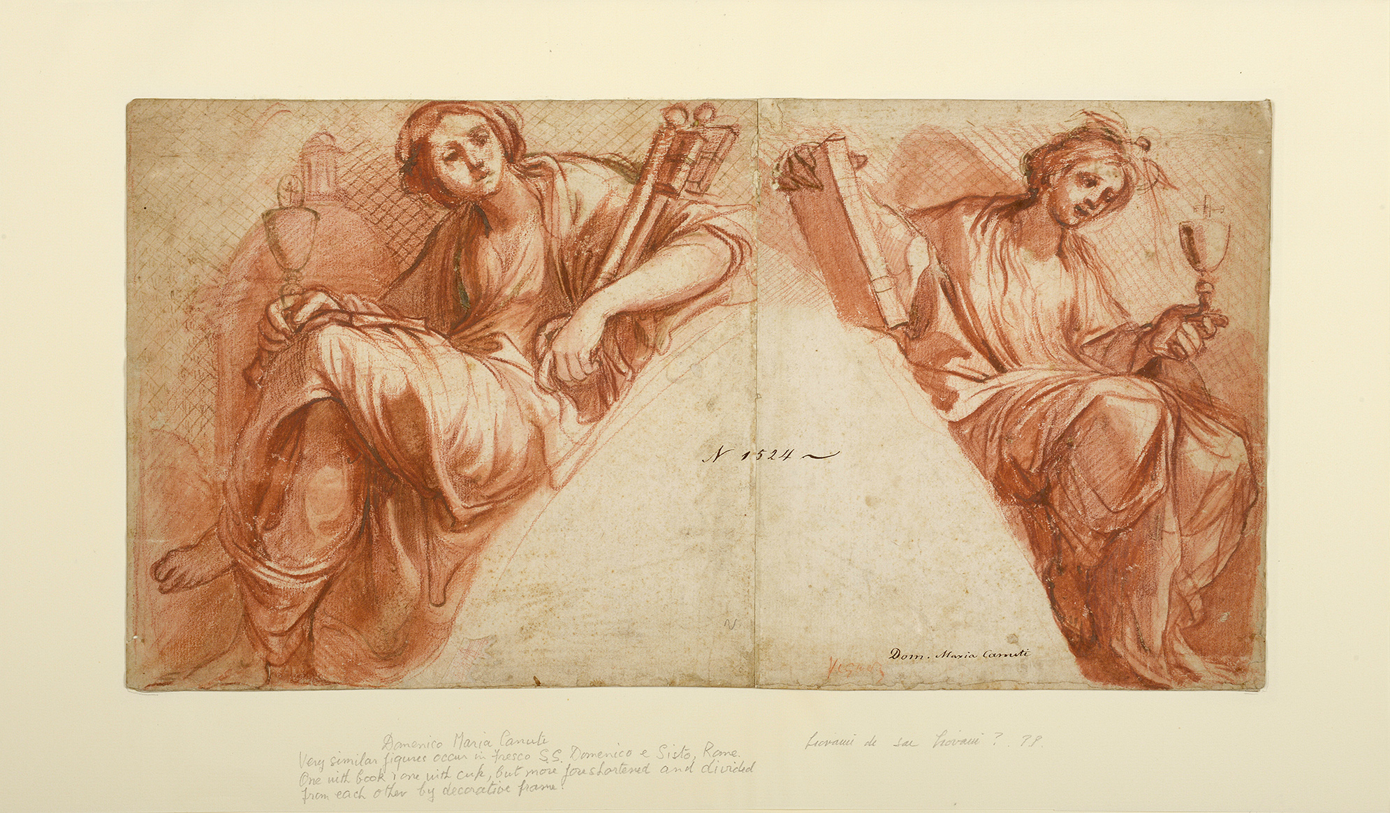 Further inscribed (in a modern hand) Domenico Maria Canuti / Very similar figures occur in fresco S.S. Domenico e Sisto, Rome. / One with book + one with cup, but more foreshortened and divided / from each other by decorative frame. in pencil on the old mount.