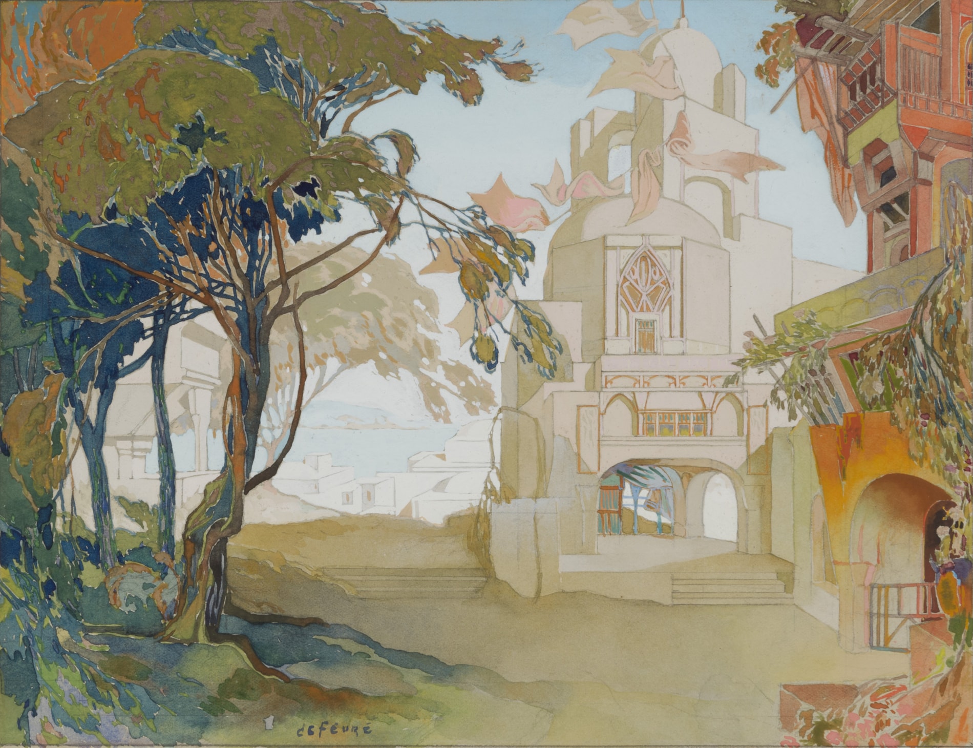 Like such contemporaries as Alphonse Mucha and Eugène Grasset, Georges de Feure was equally adept in the field of applied or decorative arts. Aptly described by one modern scholar as ‘the most art nouveau of all the Symbolists’, De Feure embarked on an association with the Art Nouveau pioneer Siegfried Bing that was to establish his reputation. He decorated the facade and designed two suites of furniture for Bing’s Pavillon de l’Art Nouveau at the great Exposition Universelle of 1900, a project that earned extravagant praise from critics, and thereafter worked closely with Bing as an artiste-décorateur, providing numerous designs for furniture, stained glass, wallpaper, ceramics and lamps. In 1903 a large exhibition of his decorative work for Bing’s Galerie de l’Art Nouveau was held in Paris, later travelling to The Hague and Hamburg. De Feure also established his own atelier, which handled commissions from other sources, such as Julius Meier-Graefe’s gallery La Maison Moderne. He continued to work as a designer and interior decorator after Bing’s death in 1905, and also undertook a number of commissions for scenery and costume designs for the stage. Among his significant later projects was the decoration of the Parisian studio of the couturier Madeleine Vionnet in 1922, and interiors and pavilions for various expositions. Late in his career De Feure was appointed Professor of Decorative Art at the École des Beaux-Arts in Paris.
