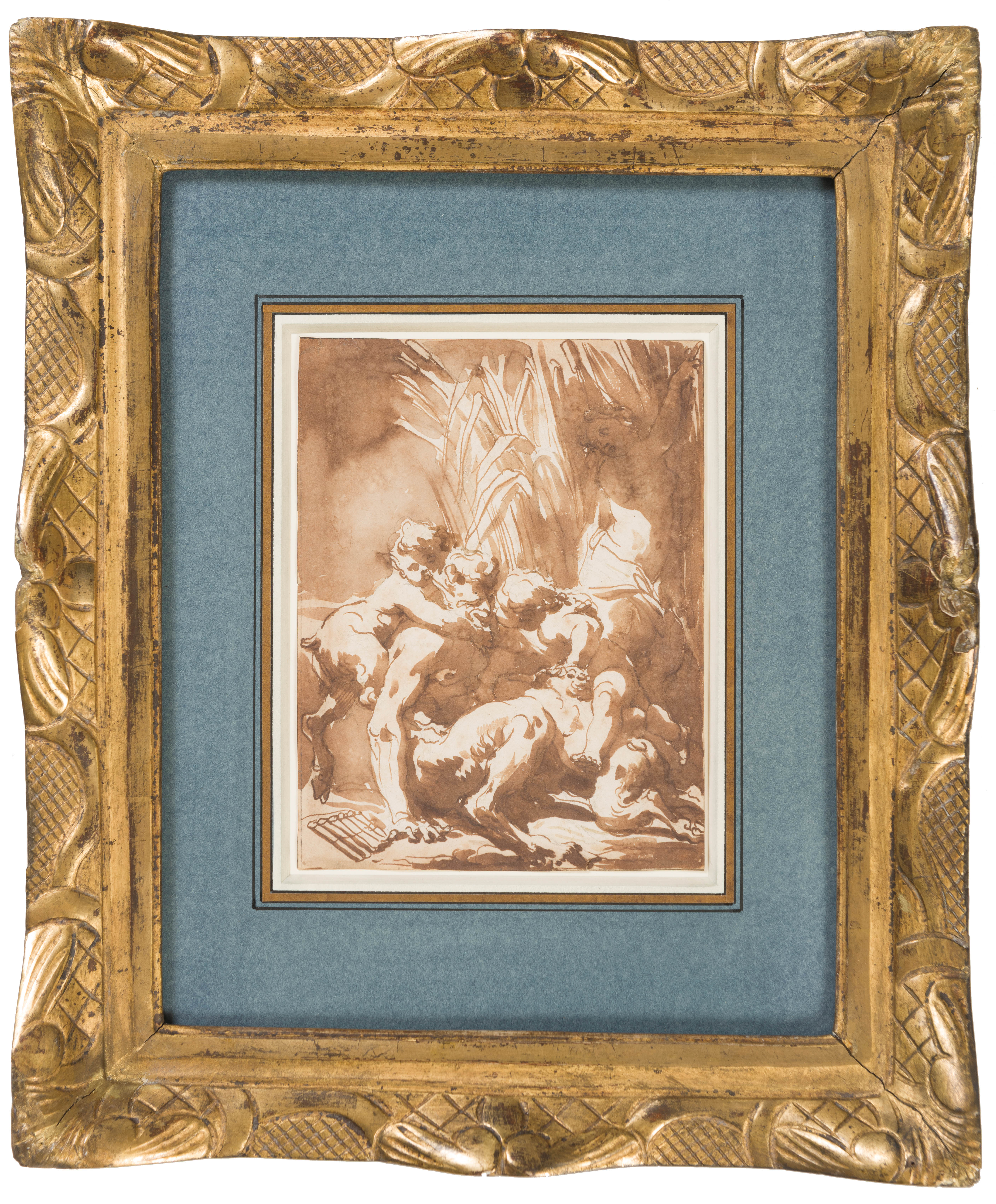 This engaging little drawing is a splendid example of Gaetano Gandolfi’s lively and spirited use of pen and wash. Donatella Biagi Maino has noted certain analogies between the present sheet (which she describes as ‘di qualità superba’) and one of Gandolfi’s finest works as a fresco painter; the mythological scenes painted on the ceilings of the palazzetto of Conte Massimiliano Gini in Bologna, executed in 1772 with quadratura decoration by Barozzi. In particular, the lunette scenes of satyrs and putti frescoed on the lower walls of an alcove in the Casa Gini compare favourably, in their sensuousness and vivacity, with drawings such as the present sheet, as well as a similar study of a Satyr Chasing a Nymph (Pan and Syrinx) in red chalk, in the collection of the Biblioteca National in Rio de Janeiro.