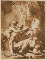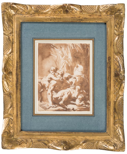 This engaging little drawing is a splendid example of Gaetano Gandolfi’s lively and spirited use of pen and wash. Donatella Biagi Maino has noted certain analogies between the present sheet (which she describes as ‘di qualità superba’) and one of Gandolfi’s finest works as a fresco painter; the mythological scenes painted on the ceilings of the palazzetto of Conte Massimiliano Gini in Bologna, executed in 1772 with quadratura decoration by Barozzi. In particular, the lunette scenes of satyrs and putti frescoed on the lower walls of an alcove in the Casa Gini compare favourably, in their sensuousness and vivacity, with drawings such as the present sheet, as well as a similar study of a Satyr Chasing a Nymph (Pan and Syrinx) in red chalk, in the collection of the Biblioteca National in Rio de Janeiro.