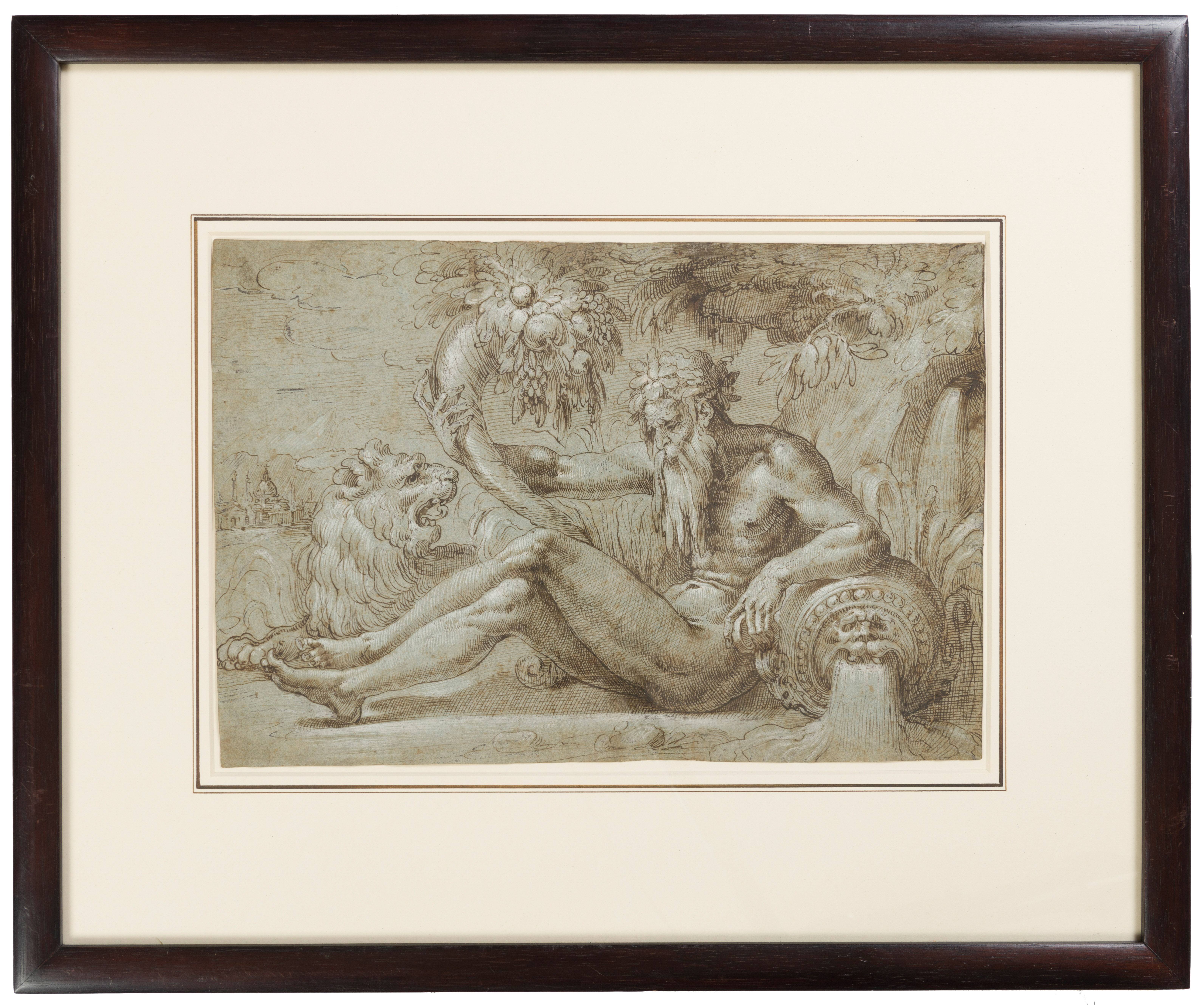 Vasari’s decorative scheme for La Talanta was commissioned from the artist in December 1541, during his first visit to Venice, by a group of Venetian noblemen calling themselves the Compagnia della Calza ‘Sempiterni’, who were to perform Aretino’s play during the Carnival. Known as the Apparato dei Sempiterni, the project consisted of wall paintings of allegorical figures of Virtues interspersed with large, monochrome landscapes of Venice and its territories, together with ceiling paintings representing the four times of day and the hours. River gods appeared in several of the wall decorations for La Talanta, and one of these panels depicted the river gods of the Arno, the Tiber and the Appenine together. The present sheet, while not by Vasari himself, closely matches his written description of the Arno river god, in a letter of 1542 to his patron Ottaviano de’ Medici in Florence: ‘on the other wall there was our Arno who had a garland of corn, millet and sorghum, and a cornucopia filled with fruits, holding an open water vessel on a lion, a lily in his hand, he was resting on a lion turning his head towards the Tiber, who was also there…’ Vasari’s letter to Ottaviano de’ Medici, composed immediately after the performance of La Talanta in February 1542, contained a detailed description of the various paintings that made up the Apparato dei Sempiterni. Since the decoration was dismantled shortly afterwards, and is no longer extant, this letter is one of the best records of the appearance of the work, alongside the dozen or so autograph drawings for the project that survive, as well as several copies of lost drawings by Vasari for the same commission.