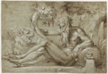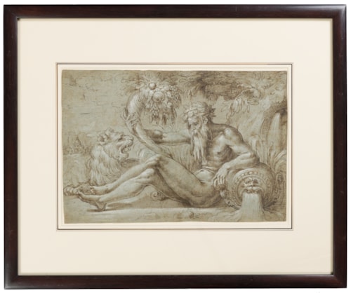 This large sheet depicts the river god Arno accompanied by the Marzocco, the lion symbolic of the city of Florence, together with a view of what appears to be Florence (or perhaps Rome?) in the distance. Although this fine drawing was attributed to Giorgio Vasari by the scholar A. E. Popham, more recently Florian Härb has pointed out that ‘the dry handling of the pen and its overall flat appearance excludes Vasari’s authorship.’ He suggests, however, that the present sheet, which is datable to the 1540s or 1550s, may be a copy after a lost drawing by Vasari, and further notes that it is similar in type, if not in style, with a number of drawings of river gods by Vasari – in Berlin, Liverpool and Paris - that were studies for the now-lost decoration of a room in a Venetian palace intended to accompany a performance of Pietro Aretino’s play La Talanta in 1542.
