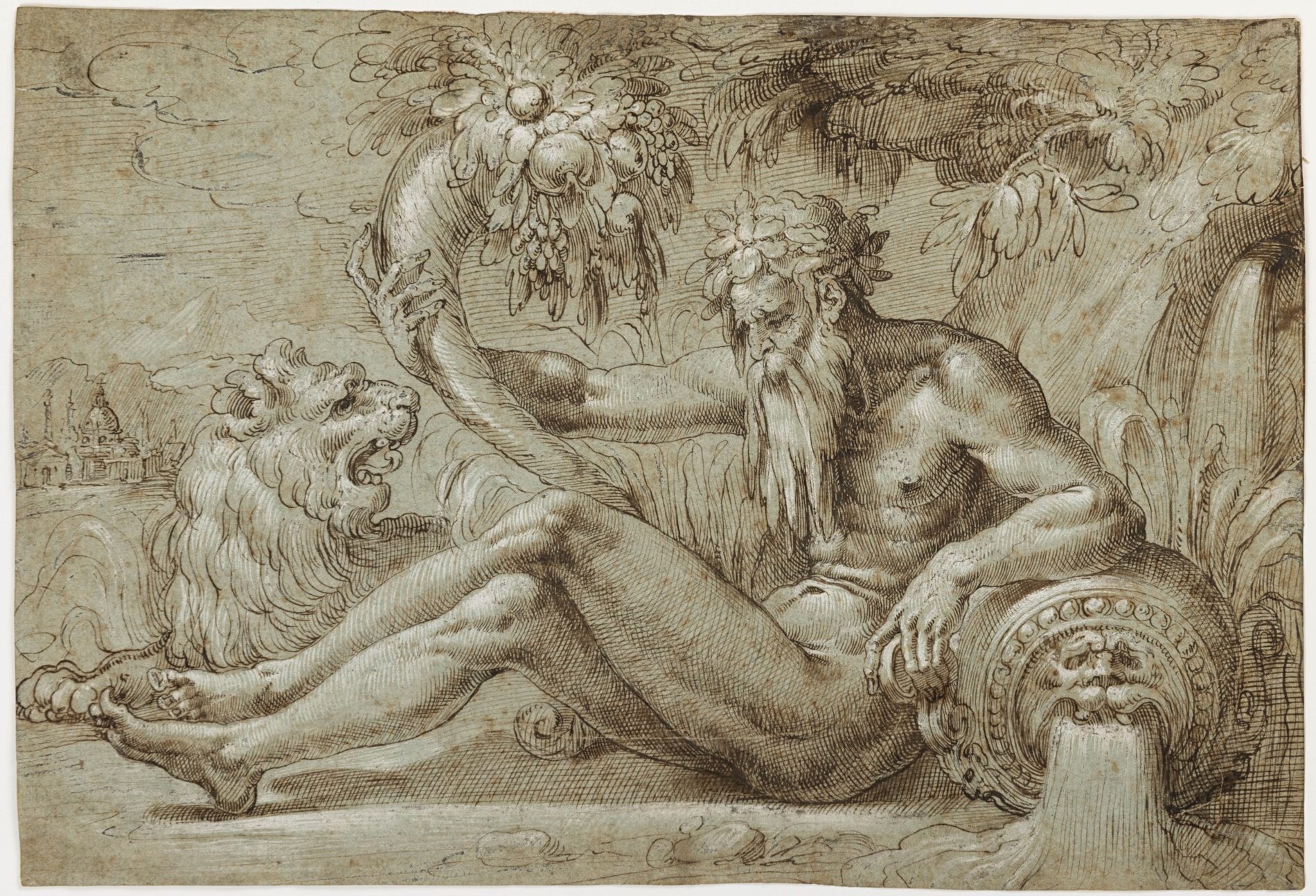 Vasari’s decorative scheme for La Talanta was commissioned from the artist in December 1541, during his first visit to Venice, by a group of Venetian noblemen calling themselves the Compagnia della Calza ‘Sempiterni’, who were to perform Aretino’s play during the Carnival. Known as the Apparato dei Sempiterni, the project consisted of wall paintings of allegorical figures of Virtues interspersed with large, monochrome landscapes of Venice and its territories, together with ceiling paintings representing the four times of day and the hours. River gods appeared in several of the wall decorations for La Talanta, and one of these panels depicted the river gods of the Arno, the Tiber and the Appenine together. The present sheet, while not by Vasari himself, closely matches his written description of the Arno river god, in a letter of 1542 to his patron Ottaviano de’ Medici in Florence: ‘on the other wall there was our Arno who had a garland of corn, millet and sorghum, and a cornucopia filled with fruits, holding an open water vessel on a lion, a lily in his hand, he was resting on a lion turning his head towards the Tiber, who was also there…’ Vasari’s letter to Ottaviano de’ Medici, composed immediately after the performance of La Talanta in February 1542, contained a detailed description of the various paintings that made up the Apparato dei Sempiterni. Since the decoration was dismantled shortly afterwards, and is no longer extant, this letter is one of the best records of the appearance of the work, alongside the dozen or so autograph drawings for the project that survive, as well as several copies of lost drawings by Vasari for the same commission.