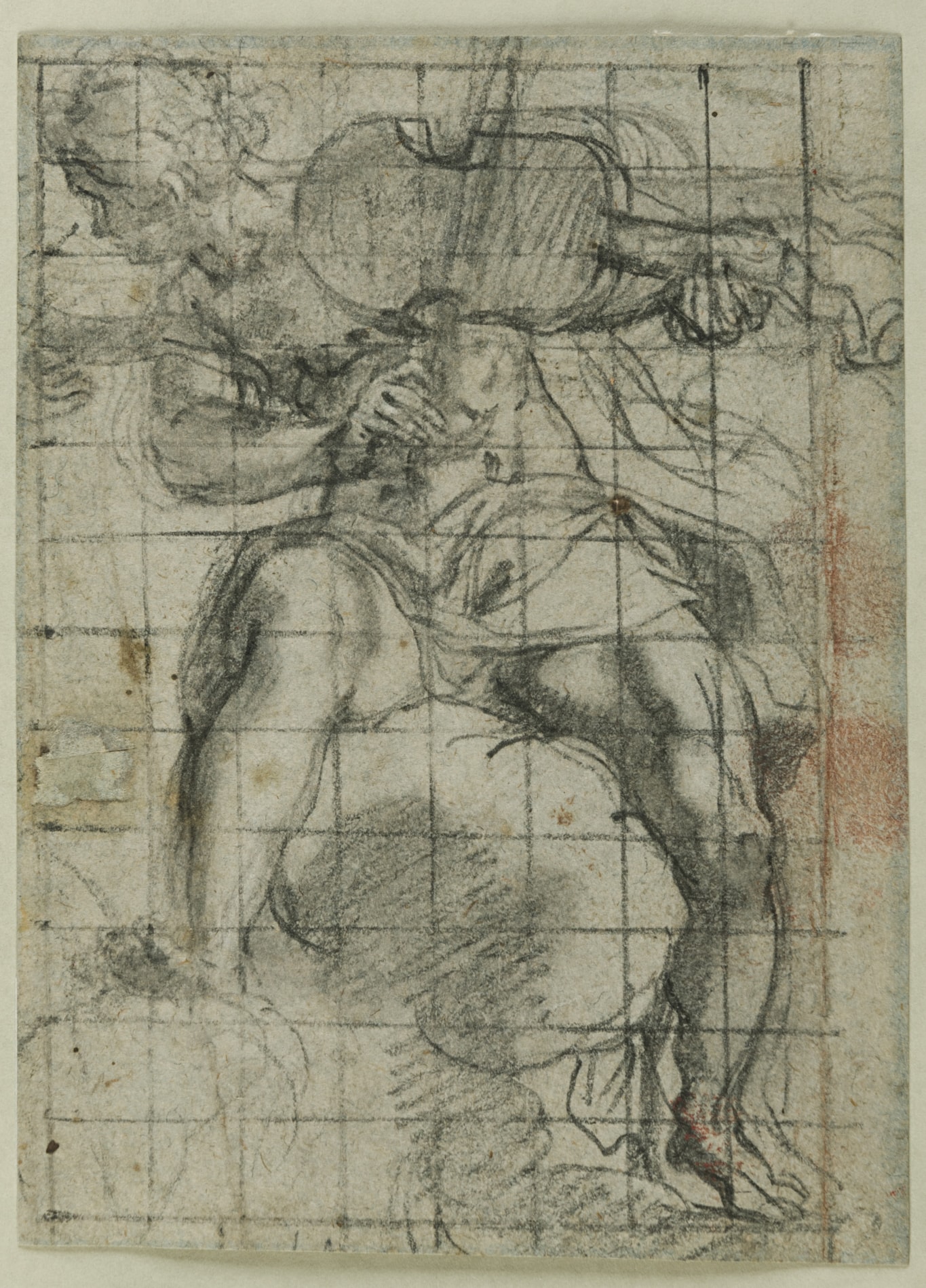 Black chalk, with touches of red chalk, squared for transfer in black chalk, on blue paper.