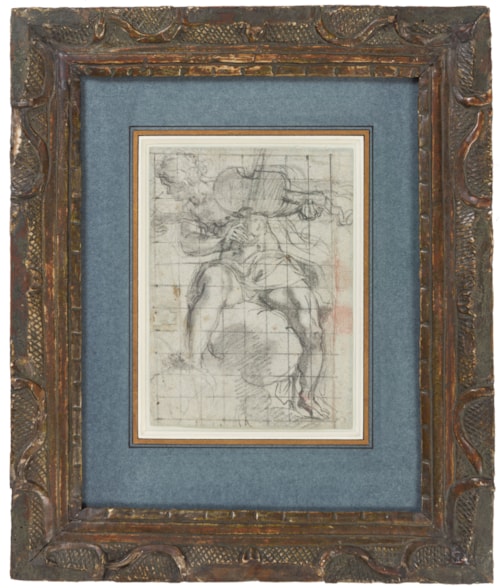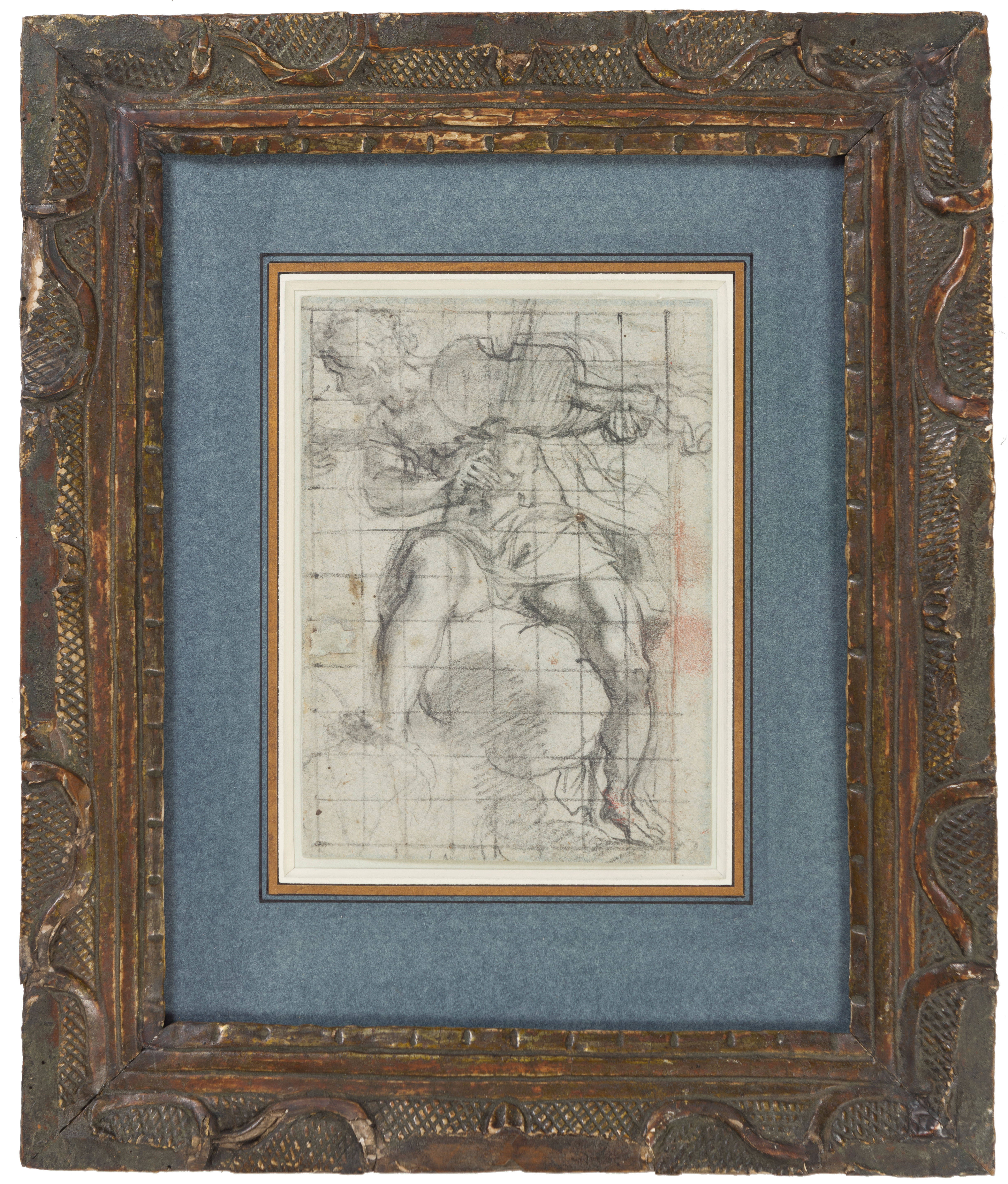 Fewer than eighty drawings by Andrea Lilio are known today, and of those only a handful have been connected with his extant paintings or frescoes. This fine, squared drawing – described by the Lilio scholar Massimo Pulini as ‘one of the most beautiful recent additions to the catalogue of [drawings by] the artist’ – is a preparatory study for a now-dismembered monumental altarpiece of The Virgin Crowning Saint Nicholas of Tolentino, signed and dated 1598. Painted for the church of Sant’Agostino in Ancona, the remnants of the painting are today, in four fragments, in the collection of the Pinacoteca Civica there. One of these fragments depicts a panoramic view of Ancona from the sea, with part of the feet of a seated figure visible in the clouds at the upper right, which precisely match those of the angel in the present sheet. This music-making angel was therefore depicted, playing his violin in the skies above the city, in the upper part of the altarpiece. While the entire composition of The Virgin Crowning Saint Nicholas of Tolentino is difficult to determine from the few sections of the canvas that survive, the scale of these fragments – one of which depicts an angel playing a lute - indicates that the altarpiece must have been among the largest canvases to have been painted by the artist.