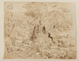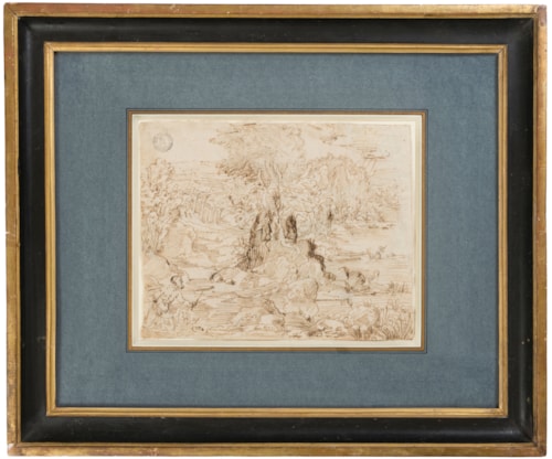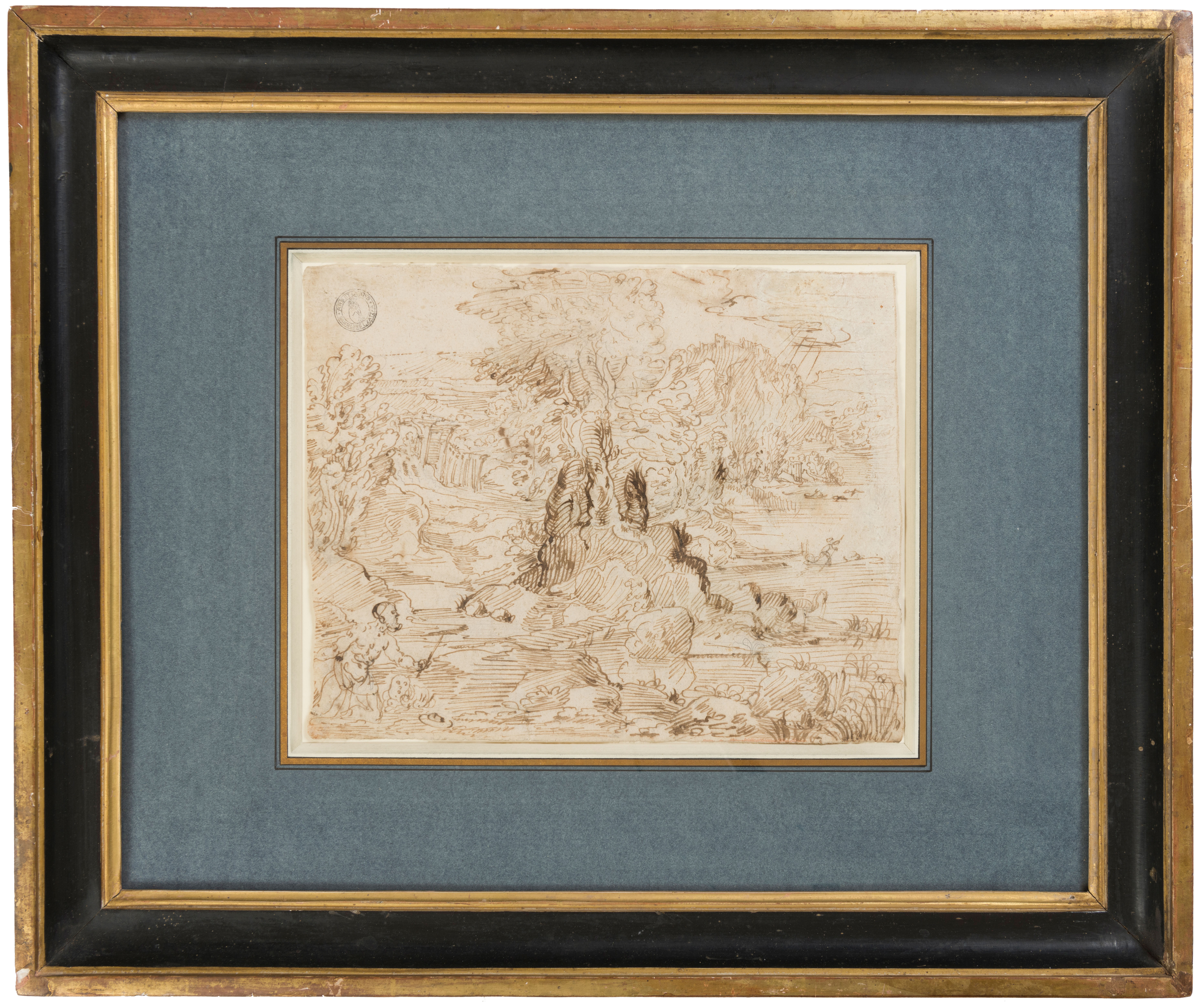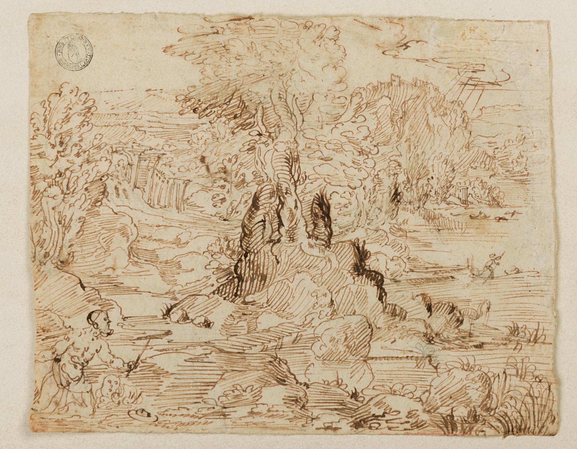 The recto of the present sheet is a fine and typical example of Pozzoserrato’s imaginary pen landscapes. As Teréz Gerszi has written of the artist, ‘Toeput varied his manner in the landscape drawings according to their different purposes, [and] these sheets reveal the individual mark of the artist far more than his figure studies. His landscapes and townscapes known thus far, over fifty in number, bear witness to a wide-ranging interest in natural and manmade subjects, including mountains, forests, riversides, rocky scenes, and gardens of Veneto villas.’ Among stylistically comparable drawings by Pozzoserrato is a Landscape with a Falconer in the Musée Bonnat-Helleu in Bayonne and a Landscape with a Hercules and the Ox-Driver in the Hermitage in St. Petersburg; the latter was reproduced in an engraving by Jan Sadeler I.