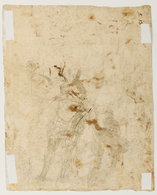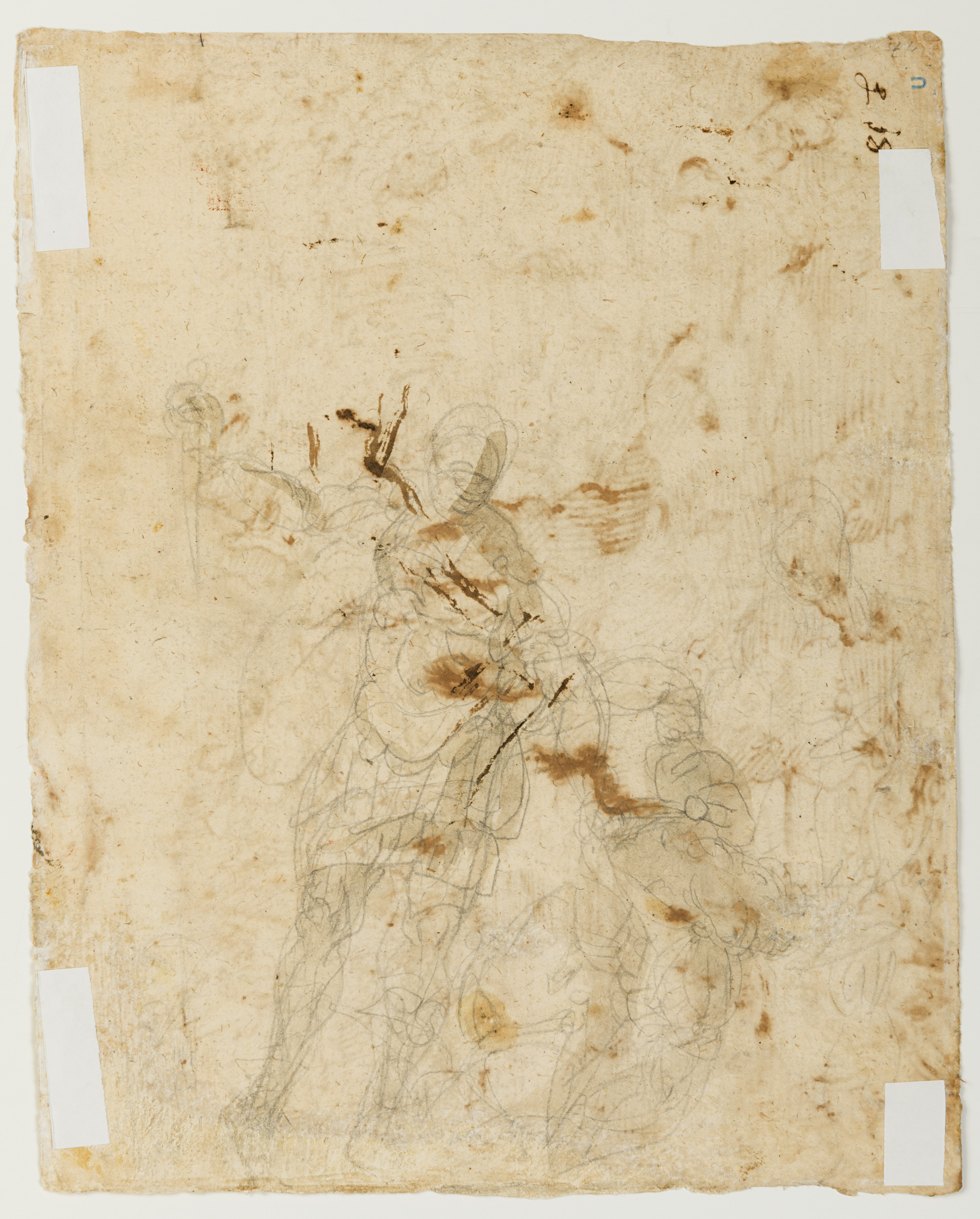 While the black chalk sketch rapidly drawn on the verso of this sheet cannot be definitively related to any extant painting by Pozzoserrato, it may perhaps be a first idea for the figure of Saint Michael in his altarpiece of Saint Michael Archangel Defeating the Devil, in the church of San Leonardo in Treviso.