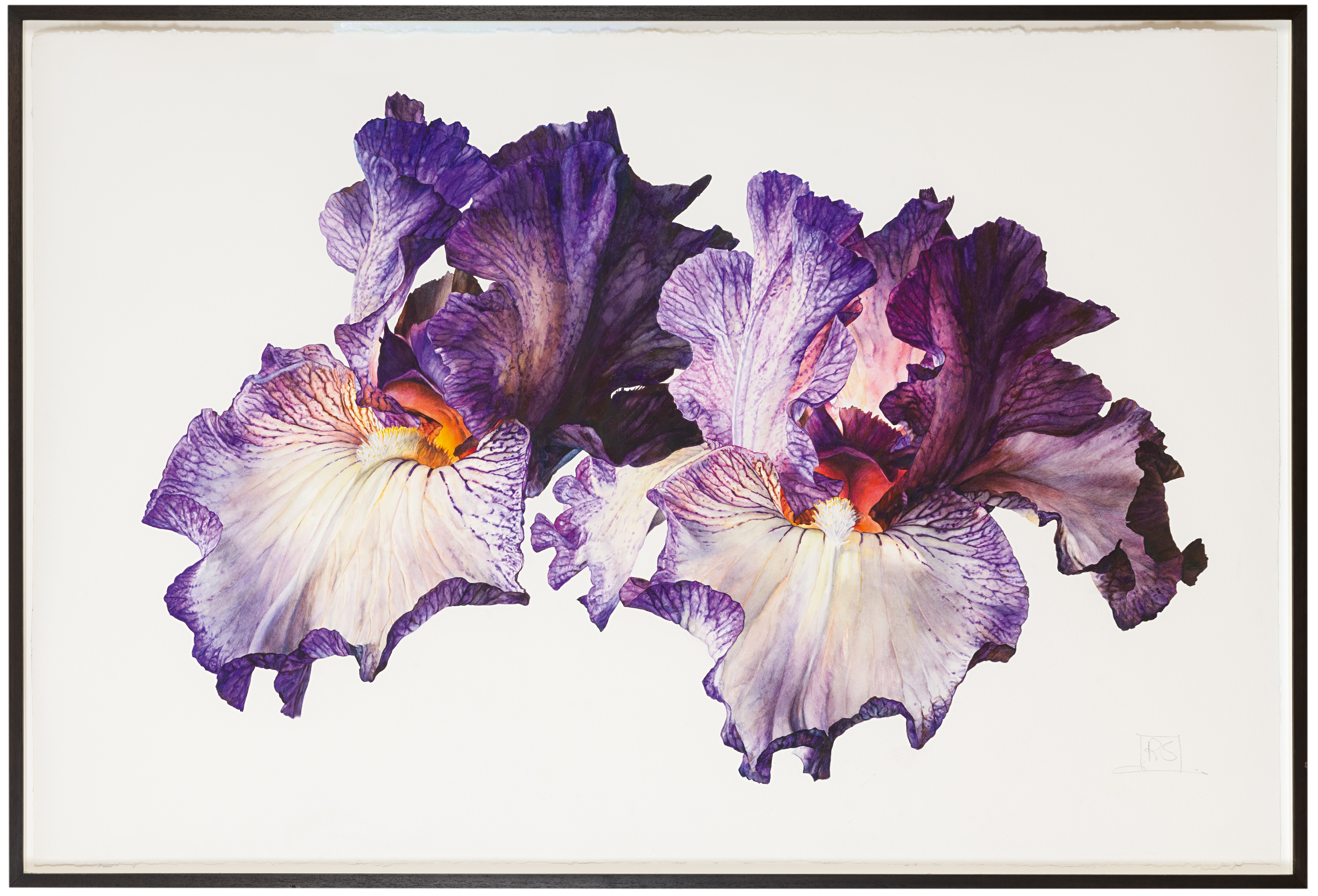 Irises make up a significant proportion of Sanders’s watercolours of flowers. As she has stated, ‘Irises I actually love, it’s one of my most favourite things…Irises are so…sensual and voluptuous and there’s something about the way [the] petals come out…and it’s that that I…want to get the feel of.’ In another interview, Sanders added that ‘I tend to go with the plant. If it moves a bit, I’ll go with it. With irises I would have quite a few Gardening stems because they don’t last long enough for you to do the whole painting. I probably get one large petal done in a day and you come down next morning and it’s died. Then you simply splice another one in…I do like subjects that have a certain presence. I am not so keen on orchids now, they are a bit stiff, whereas irises are so soft and sexy but have this incredible strength. They are like women. They don’t get blown over, they stand tall. They are powerful and feminine.’