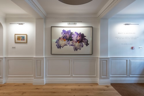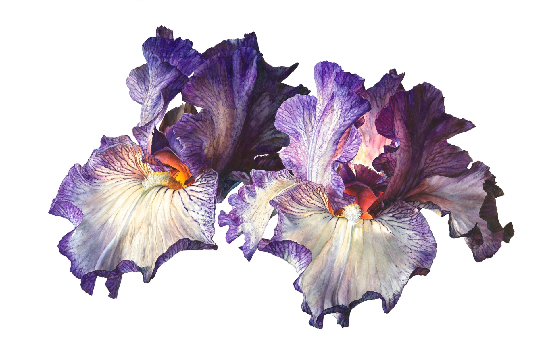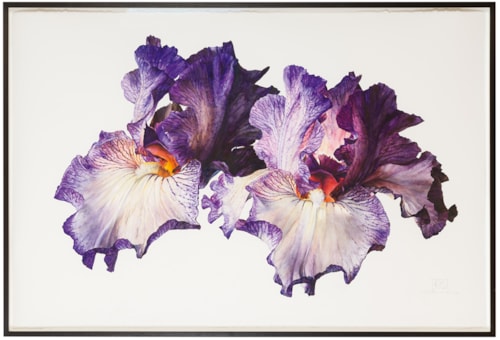 Irises make up a significant proportion of Sanders’s watercolours of flowers. As she has stated, ‘Irises I actually love, it’s one of my most favourite things…Irises are so…sensual and voluptuous and there’s something about the way [the] petals come out…and it’s that that I…want to get the feel of.’ In another interview, Sanders added that ‘I tend to go with the plant. If it moves a bit, I’ll go with it. With irises I would have quite a few Gardening stems because they don’t last long enough for you to do the whole painting. I probably get one large petal done in a day and you come down next morning and it’s died. Then you simply splice another one in…I do like subjects that have a certain presence. I am not so keen on orchids now, they are a bit stiff, whereas irises are so soft and sexy but have this incredible strength. They are like women. They don’t get blown over, they stand tall. They are powerful and feminine.’