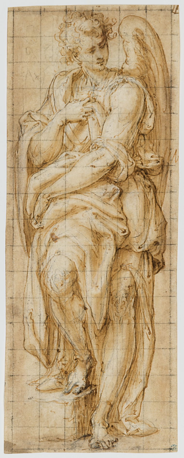 The present sheet, squared for transfer, is a preparatory study for Aurelio Luini’s altarpiece of The Baptism of Christ, painted c.1570-1575, in the parish church of Santi Giacomo and Brigida in the town of Cassago Brianza in Lombardy. Following tradition, the Baptism takes place in an open landscape by the river Jordan. At the centre, Christ rests his left knee on a rock while being baptised by his cousin, Saint John, who stands at the right. At the left, four angels gather to witness the event. This drawing, which also carries a light silhouette of a right leg on the verso, relates closely to the standing angel in the left foreground of the Baptism. The pose of the angel in the present sheet, resting his right foot on a stone - thus echoing the pose of Christ – and holding his tunic with both hands, is virtually identical to that in the painting. Slight variations between drawing and painting, such as the tilting of the angel’s head and the height of his wing, are the result of adjustments made by the painter directly on the canvas.