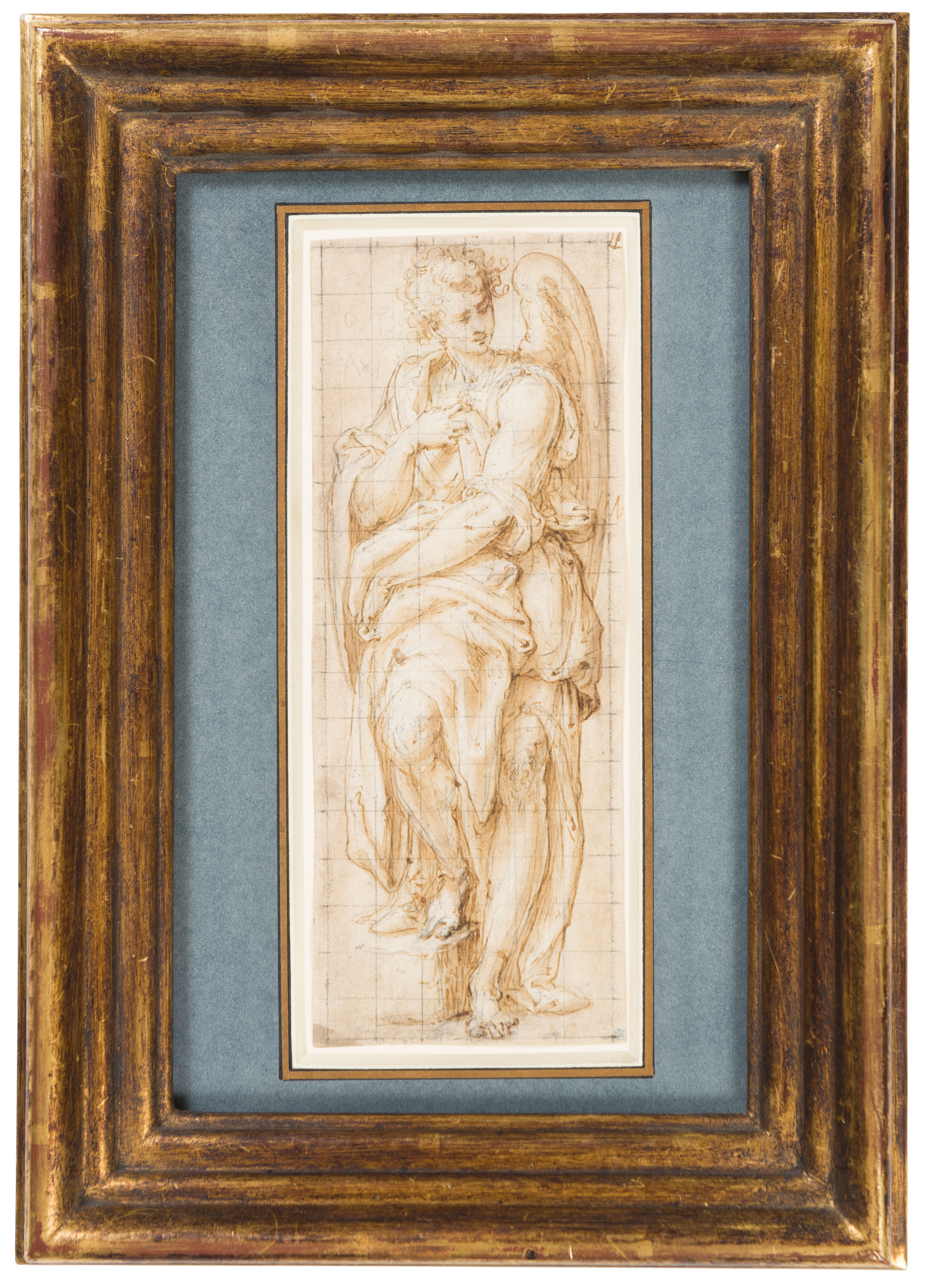 Technically, this study displays the typical traits of Aurelio’s graphic style at its best, from the confident use of pen and ink to the carefully modulated chiaroscuro, down to signature traits, such as the flying curls and gnarled fingers and toes. The drawing’s high level of finish, emphasised by the combined use of brown wash and white heightening, together with the presence of squaring for transfer, indicate that Aurelio was approaching the final stage of the preparatory process, just prior to the cartoon. Given the grace and refinement of this drawing, it comes as no surprise that it was preserved in the workshop for future re-use. A preliminary sketch by Luini for the figures of Christ and Saint John the Baptist in the Cassago Brianza canvas was on the art market in Paris in 1985, while another preparatory study for the same two figures appeared at auction in Milan in 1979.