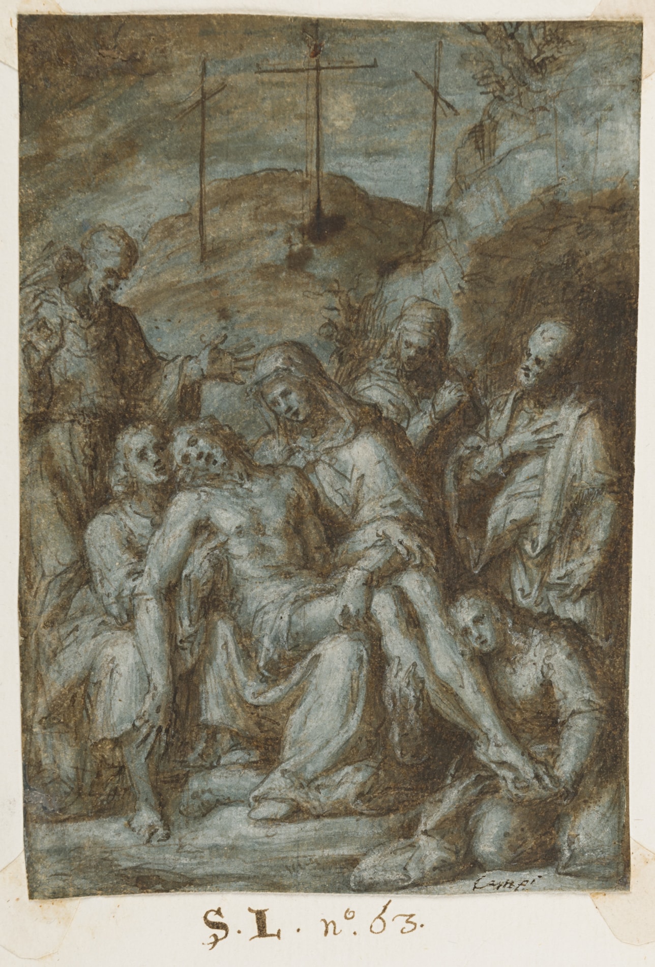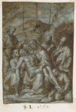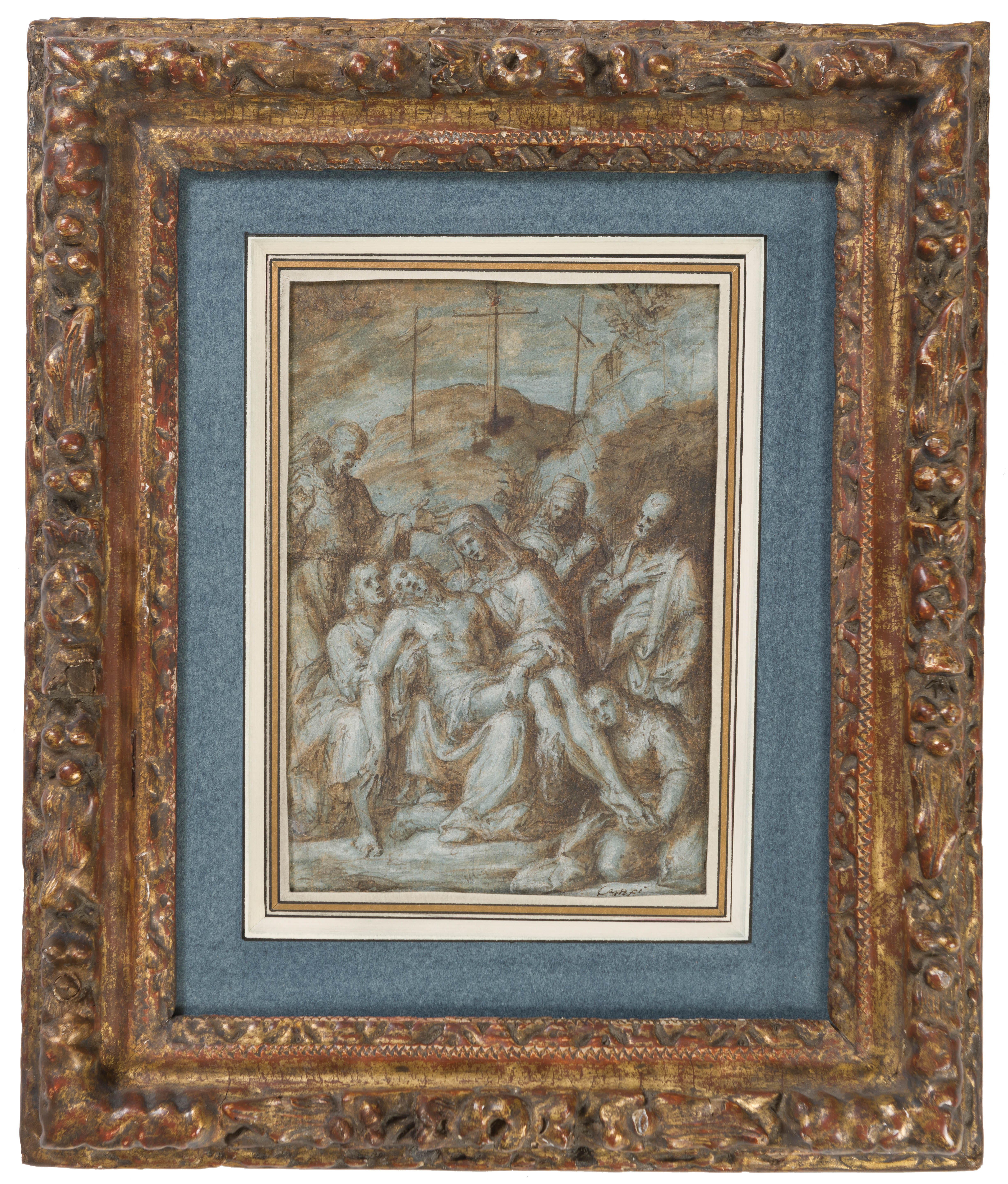 This finished compositional study was first attributed to Aurelio Luini by the late Mario di Giampaolo in 2002. The scene takes place on Golgotha, or Calvary, in the tenebrous aftermath of the Crucifixion. Christ’s lifeless body is supported by the Madonna, Mary Magdalene, and Saint John the Evangelist, while Joseph of Arimathea, Nicodemus, and a holy woman have gathered around them in prayer. The drawing shows Aurelio approaching the final scheme of what was certainly to be an altarpiece. The artist has already decided upon the overall arrangement and the reciprocal interactions of the figures and here sets the scene’s emotional tone. The evident similarities with Aurelio’s altarpiece of Lamentation over the Dead Christ, painted around 1575-1580 for the church of Santi Paolo and Barnaba in Milan and still in situ there – in particular, the Saviour’s expanded torso, reclining head, and the pose of his right arm – might suggest that the artist made this drawing in preparation for that painting, before deciding to simplify the composition and reduce the number of figures. If so, it would have been followed by another, variant, modello, similar in nature to the present sheet. Alternatively, this study might have been made for a different Lamentation that has yet to surface; indeed, numerous paintings by Luini remain to be discovered.
