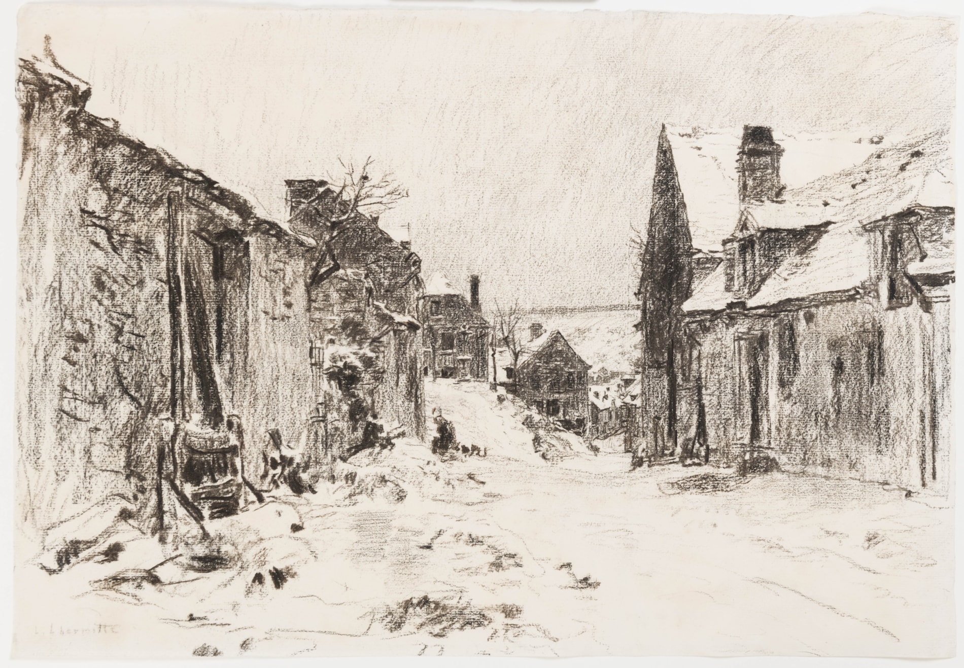 Drawn in December 1885, this large charcoal drawing depicts the artist’s birthplace of Mont-Saint-Père, a small town in the Aisne département of Northern France. Lhermitte painted and drew numerous views in and around Mont-Saint-Père, situated by the Marne river, throughout his career. Delicate, atmospheric works such as this are a hallmark of the artist’s gifted draughstmanship. As the Lhermitte scholar Monique Le Pelley Fonteny has written, ‘In his drawings he achieved a masterful subtlety between light and shadow, white and black, about which Théodore de Banville once remarked: “In his hands charcoal and black chalk are like magical tools.”’ Lhermitte’s charcoal drawings were avidly collected in France, England and America, often through the auspices of the dealer Paul Durand-Ruel. They were also much admired by other artists, notably Vincent Van Gogh, who noted of Lhermitte in a letter to his brother Theo, written in September 1885, ‘He’s a master of the figure. He’s able to do what he likes with it - conceiving the whole neither from the colour nor from the local tone, but rather proceeding from the light - as Rembrandt did - there’s something astonishingly masterly in everything he does - in modelling, above all things, he utterly satisfies the demands of honesty...When I think about Millet or about Lhermitte – then - I find modern art as great – as Michelangelo and Rembrandt - the old infinite, the new infinite too - the old genius, the new genius.’