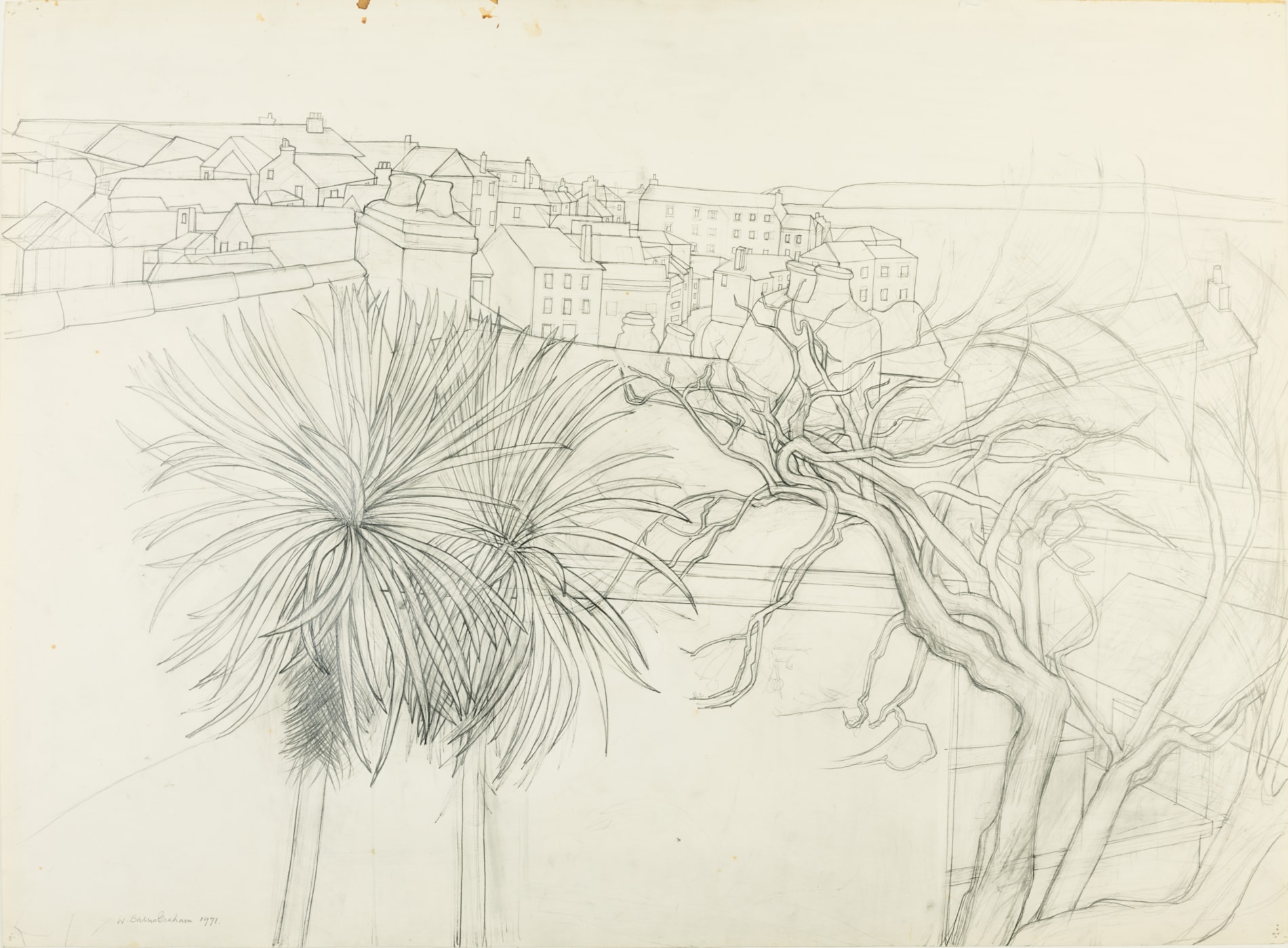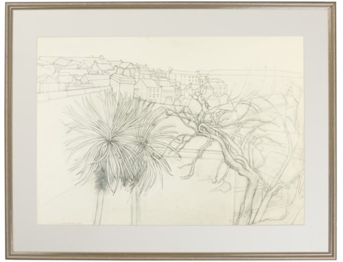 The view depicted in this large drawing, as noted on the backing board, was taken from the terrace of Ben Nicholson’s former home in the centre of St. Ives. Nicholson had moved to the house, then called Trezion, in 1955, and had renamed it Goonhilly, a Cornish name. As Nicholson described the view, in a letter of February 1955 to Herbert Read, ‘It’s an absurd place, almost as if one had made it and its surroundings oneself – v. romantic and with a whole series of different levels from which one sees between rooftops the Atlantic, the Island, St. Ives Bay, Godrevy & finally, from the topmost ‘lookout’ level, slap down into the harbour itself.’ Nicholson left Goonhilly in 1958, when he moved to Switzerland with his third wife, Felicitas Vogler.