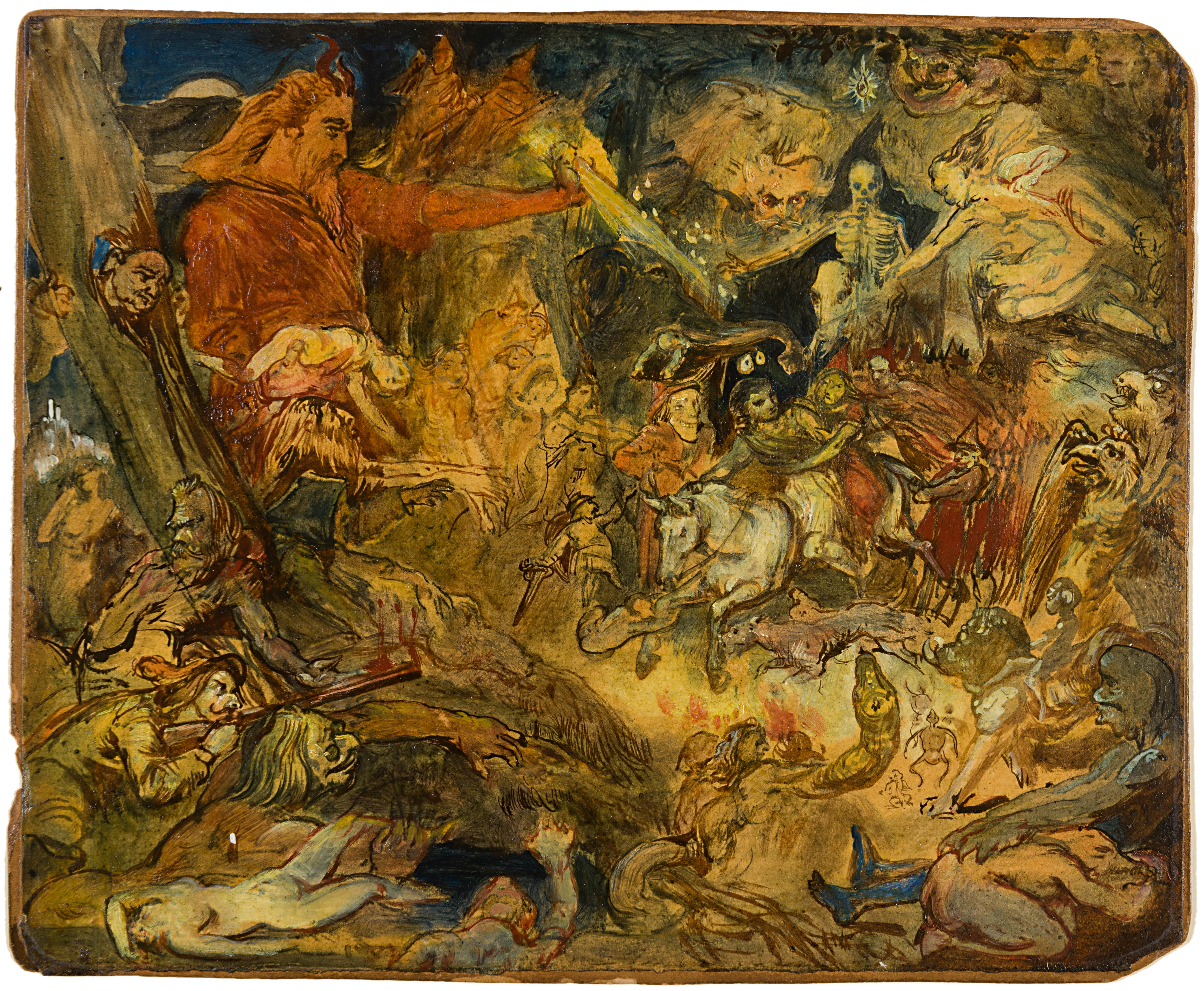 The attribution of this drawing to Theodor von Holst has been confirmed by Max Browne, who dates the sheet to c.1830-1835. The complex composition is a typical feature of the artist’s draughtsmanship, and, as Browne notes, ‘show Holst letting off artistic steam in a world that few other souls would or could venture into.’ As Gert Schiff has noted, ‘literary painter though he was, Von Holst hardly ever created illustrations but rather improvisations upon a given text. In his drawings, he starts by outlining the principal action with two, three, or more figures and then adds other motifs, rarely in the same size and quite often without relevance to the subject, sketching them around, in between, or even across the main incident. He thus creates confused, yet evocative, and, in the most literal sense, open-ended depictions which engage the viewer’s fancy by an unresolved tension between the identifiable core and those added, incommensurate, and unexplained materials. One can find in these drawings a typical reflection of the romantic mind in all its impatience...’