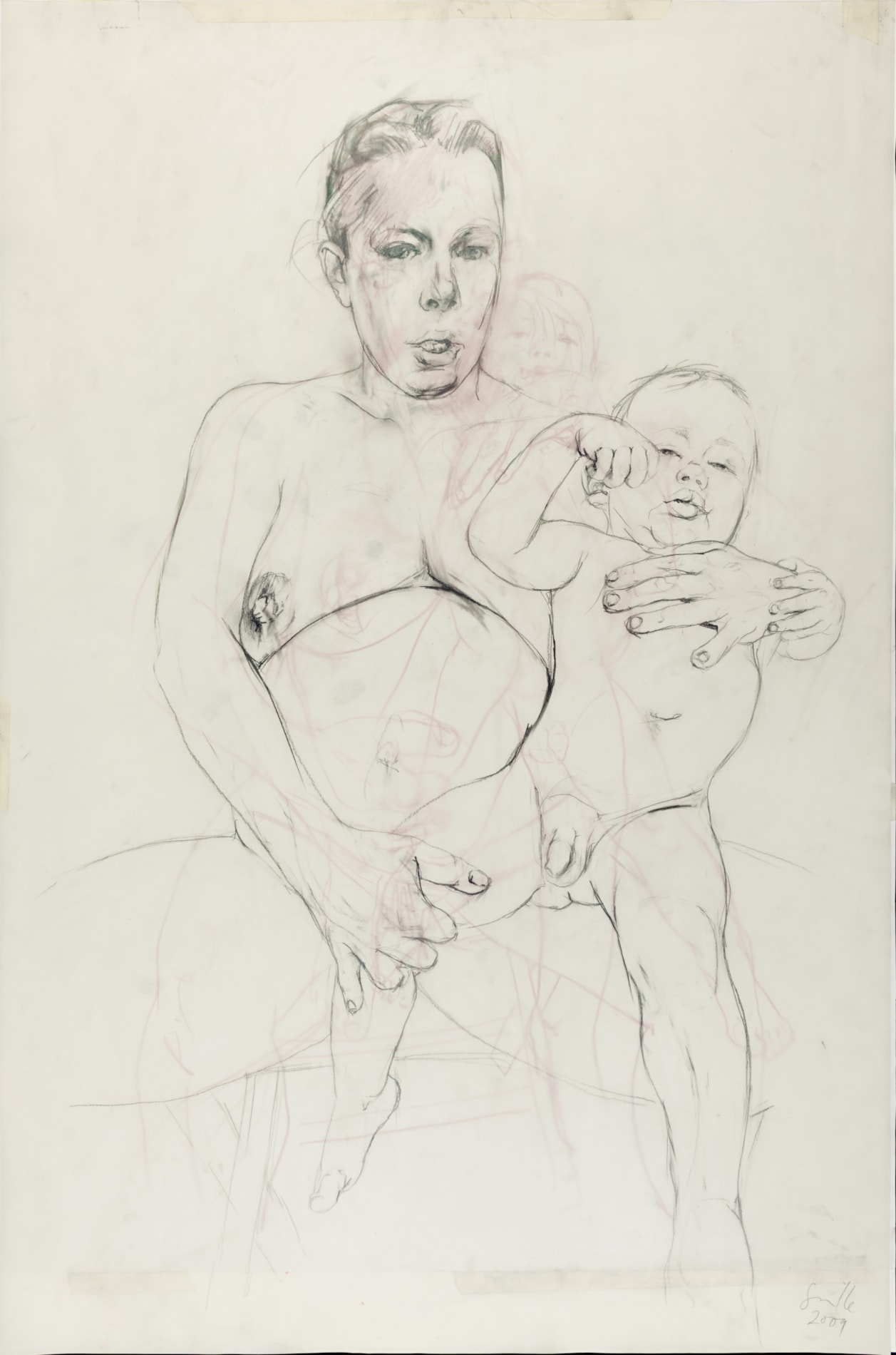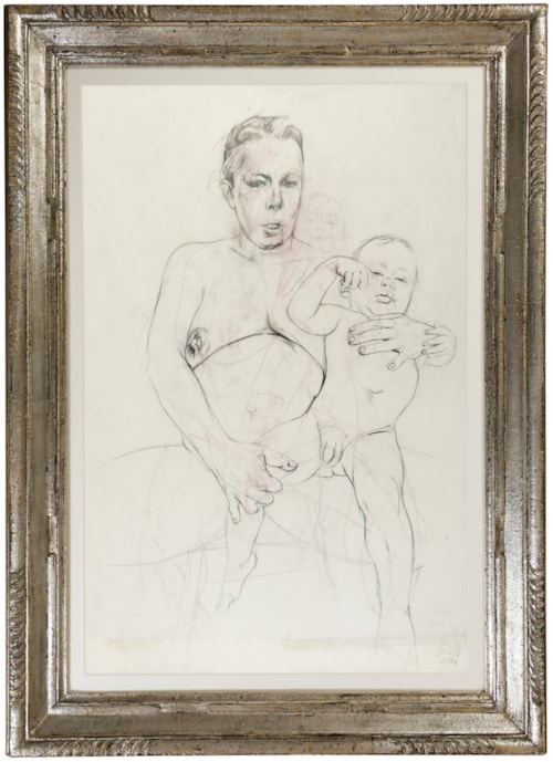 This large charcoal drawing, drawn on two sheets of paper, one superimposed over the other, is part of a group of sizeable drawings, executed by Jenny Saville between 2008 and 2011, that reflect a new interest in exploring themes of pregnancy and motherhood. While a handful of these drawings of pregnant women with infant boys are drawn in pencil and charcoal on fairly sizeable sheets of transparent vellum paper, such as the present drawing and another one of similar dimensions, most are drawn on much larger sheets of paper, sometimes well over two metres in height.