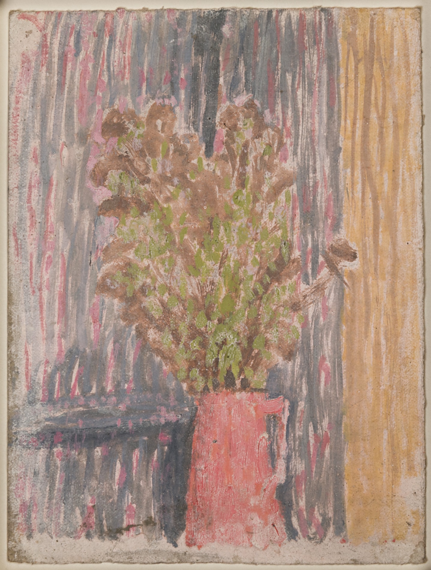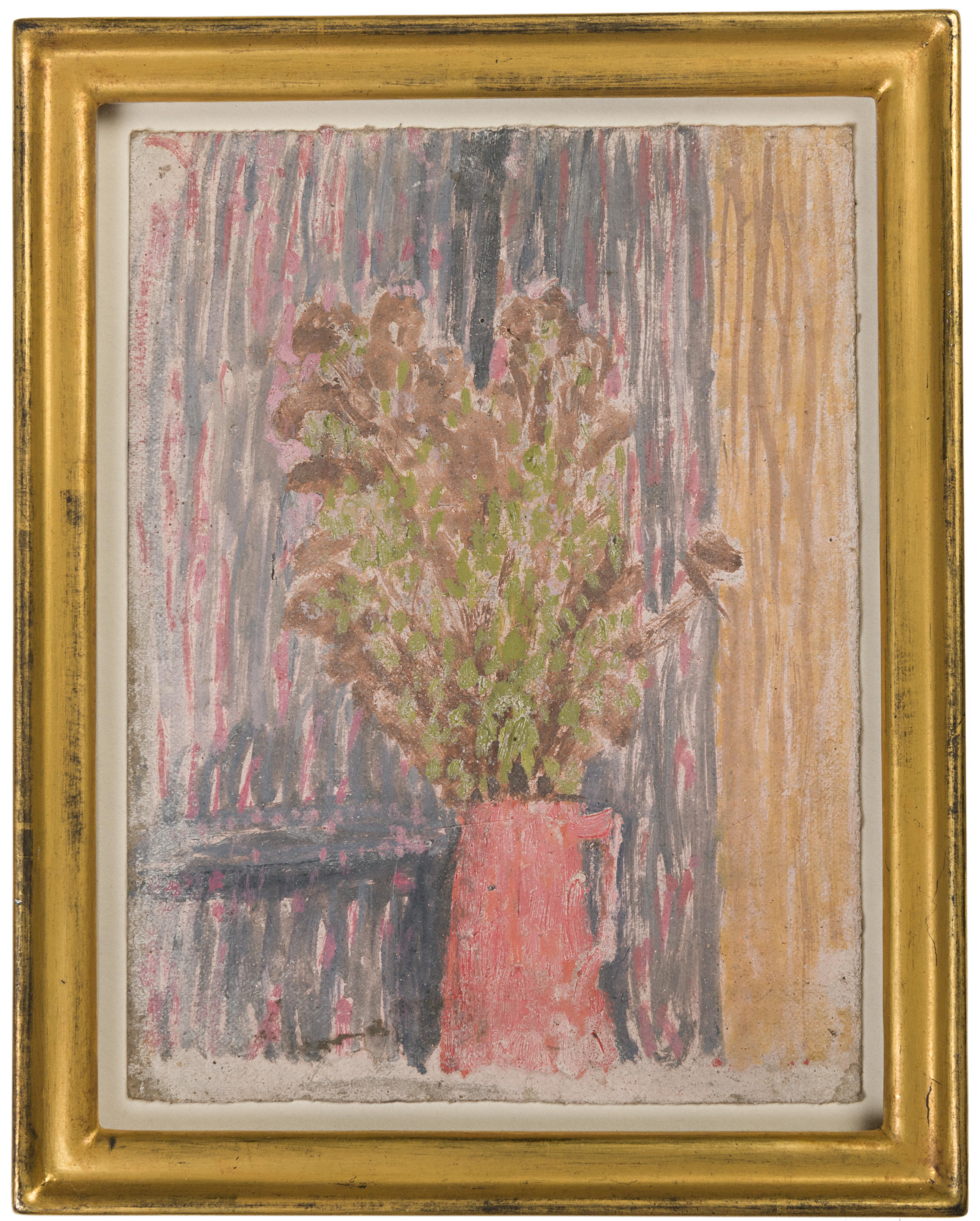 This small flower piece may likely be dated to the final decade of Gwen John’s career, when she produced a number of freely-painted gouache variants of a still-life composition of flowers in a jug. As the artist’s biographer has noted of this period in the early 1930s, ‘Flower studies…[were] repeated time and again and growing smaller. It was as if painting had become for Gwen John what saying the rosary is to others.’