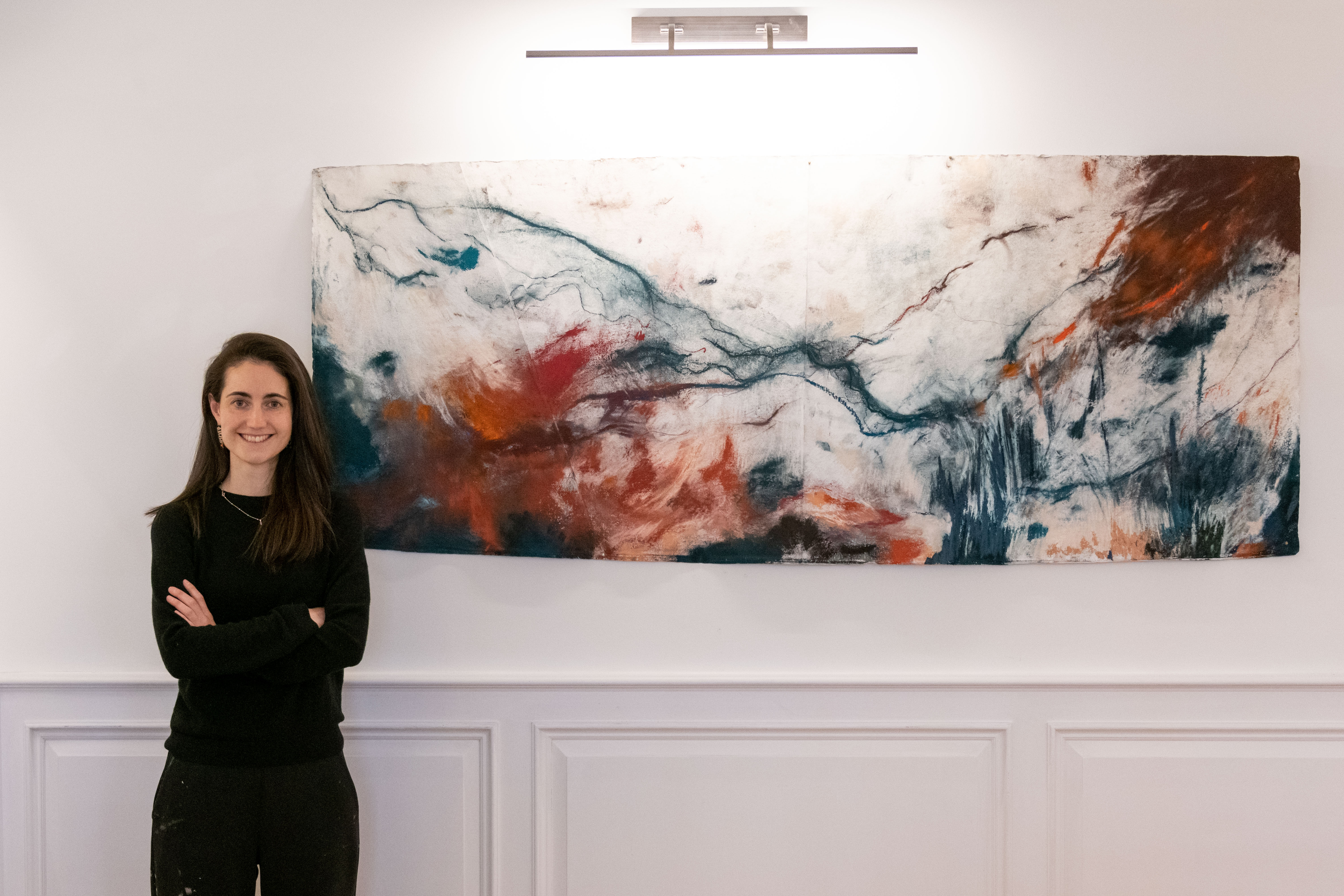This monumental pastel work, nearly two metres in length, was completed in February 2023. As the artist, Lavinia Harrington, has remarked, she began the piece ‘by working on the floor – moving on and across the paper – folding and unfolding it a number of times in the process. [The] selection of pastels [and] colour palette…resonated with particular emotional and physical sensations I hoped to grapple with and explore and overlapping ‘colour’ sensory experiences when listening to music. [The] action of making the piece evolved over the course of the end of January and February – working with timed sessions, often determined by the length of Dvorak’s music [Antonín Dvořák, Symphony No.9 in E Minor (Op.95)] – whether I listened to it all through once or multiple cycles of it back to back…My work is not illustrating a poem or piece of music, but I’ve noticed there are a series of poems and musical pieces as well as particular works that I will return to again and again over a particular arc of time and over the course of making a series of pieces.’