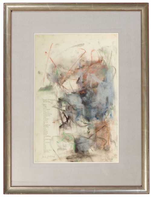 Seventeen of Joan Mitchell’s collaborative ‘poem pastels’, incorporating poems by both J. J. Mitchell and James Schuyler, were shown at the Tibor de Nagy Gallery in New York in 2002. As a New York Times review of the exhibition noted, ‘These paintings don’t necessarily illustrate the poems directly; in fact, in some cases it isn’t clear whether text or image came first. But more often than not the components share a mood.’ Of the same exhibition, another critic opined that ‘Joan Mitchell dismissed her works on paper - even painting-scale pastels of four-foot dimensions - as “lady paintings”…[however, in] petite and lovely sheets on which she combined her own pastel drawings with concrete poems by poet friends…Mitchell shows an unusually advanced sensitivity to balancing image and text on a page and making art of their interwoven imagery. The drawings are rather Zen-like, with floats and falls of icy or smoky color and hints of emerging form. They are subtle and delicate and at the same time frank and tough and sometimes angry (Not one bit ladylike!).'