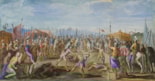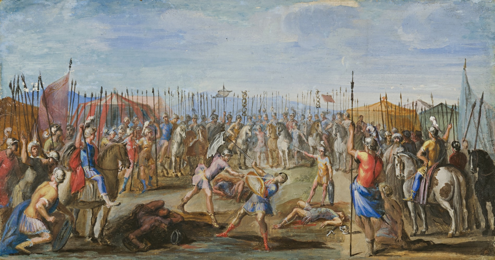 Francesco Allegrini produced a number of highly finished history scenes, executed in gouache on vellum, as independent works of art, of which the present sheet is a particularly fine example. The composition here appears to be inspired by Cavaliere d’Arpino’s large fresco of the subject in the Sala degli Orazi e Curiazi of the Palazzo dei Conservatori in Rome, painted around 1612.