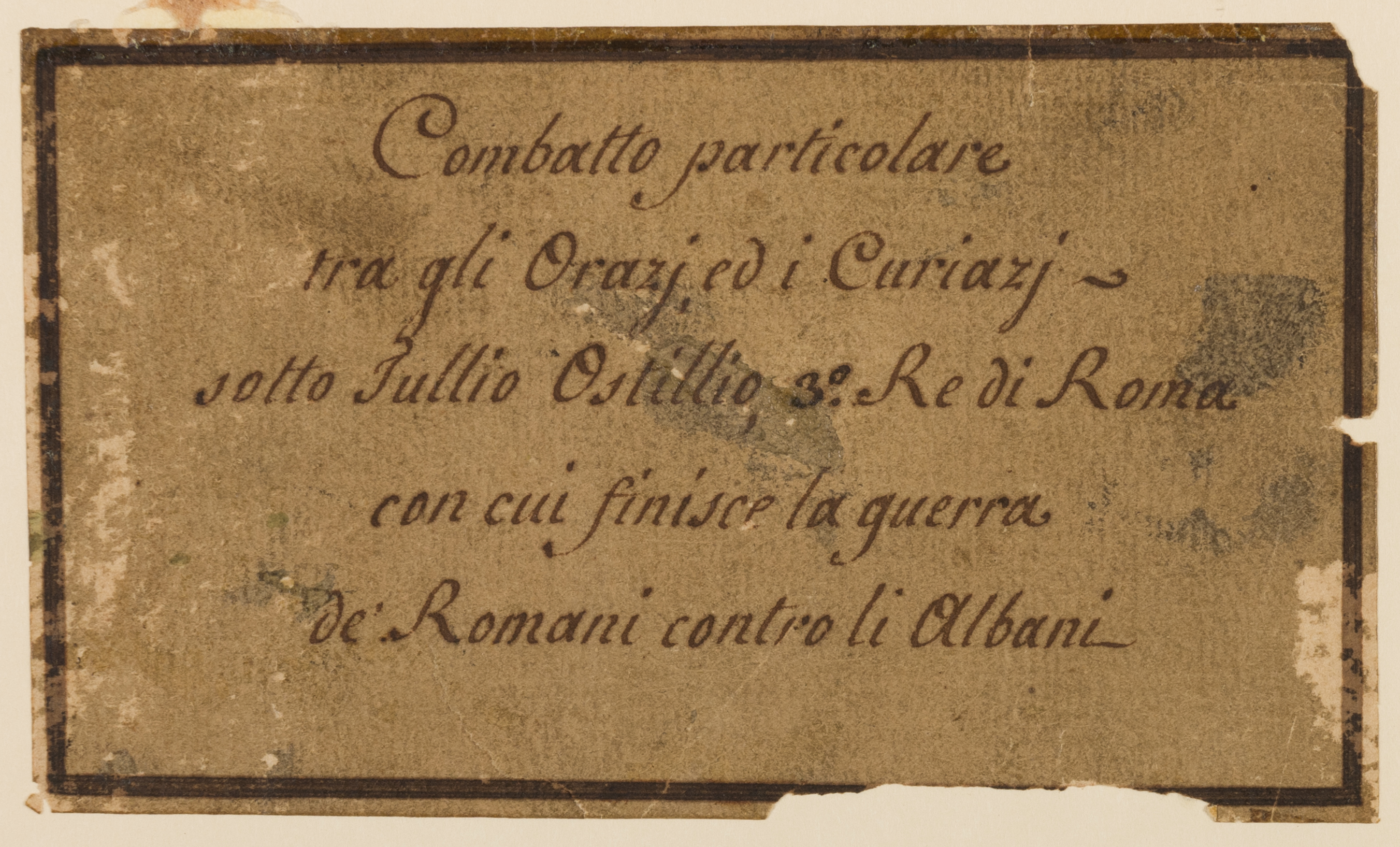 Inscribed Combatto particolare / tra gli Orazj ed i Curiazj- / sotto Tullio Ostillio, 3o Re di Roma / con cui finisce la Guerra / de’ Romani contro li Albani in brown ink on a label affixed to the old backing.