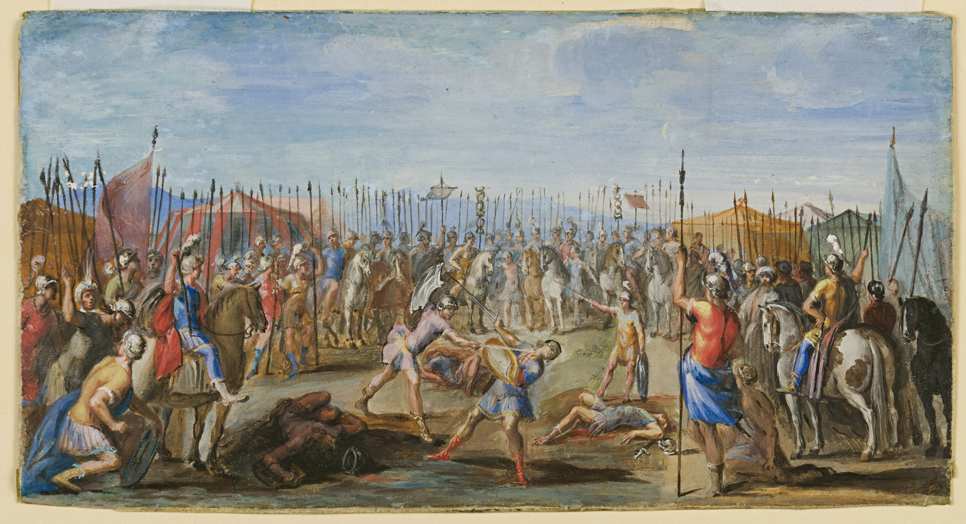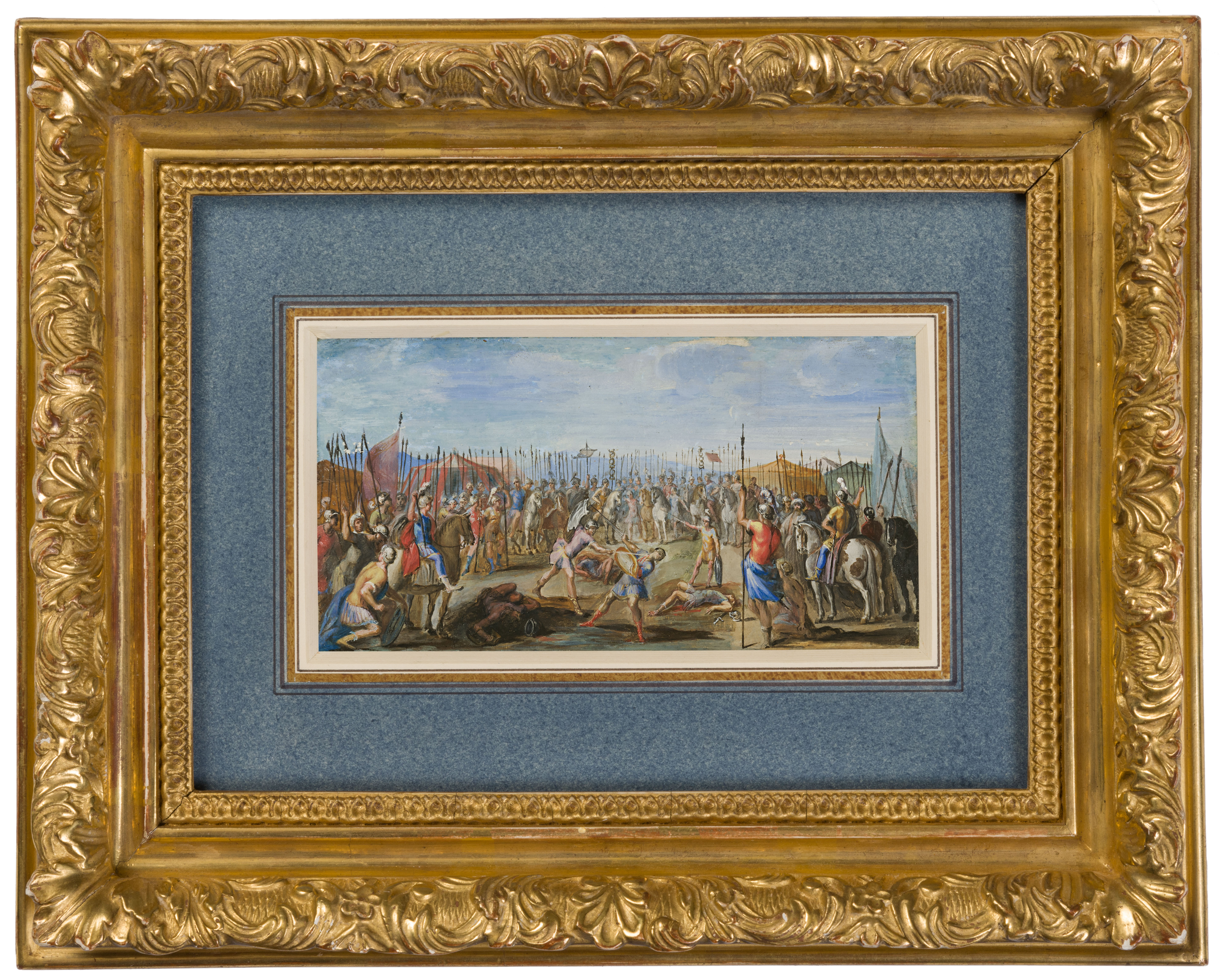 Francesco Allegrini produced a number of highly finished history scenes, executed in gouache on vellum, as independent works of art, of which the present sheet is a particularly fine example. The composition here appears to be inspired by Cavaliere d’Arpino’s large fresco of the subject in the Sala degli Orazi e Curiazi of the Palazzo dei Conservatori in Rome, painted around 1612.