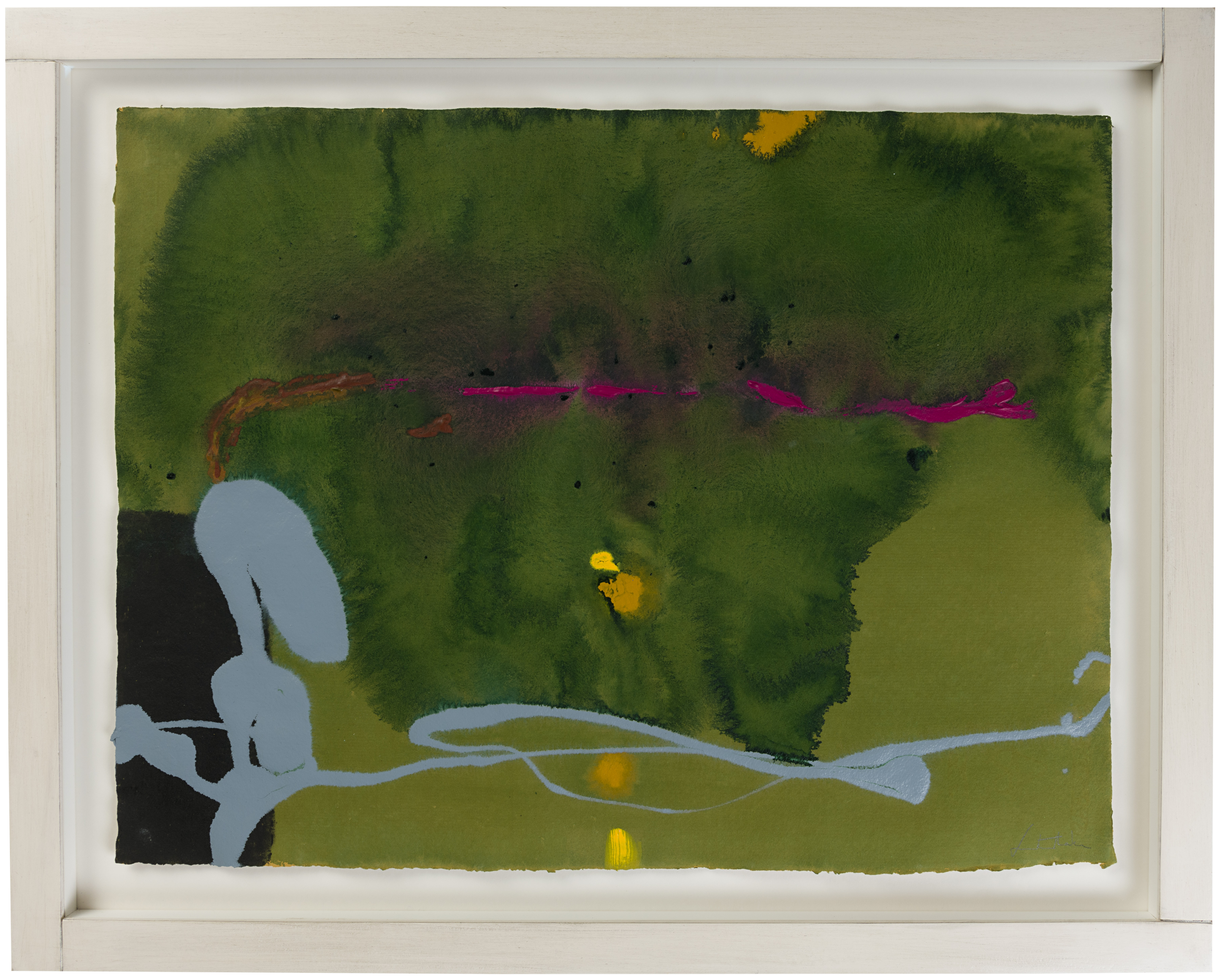 As has recently been noted by one scholar, ‘Helen Frankenthaler has spoken of the intimacy of the paper medium. Her late paintings on paper embody her belief in freshness, directness, openness, and immediacy…She has used papers tinted a wide range of colors. Some pieces were executed on Japanese paper and others on very unusual lawn grass paper. Frankenthaler has utilized brushes, sponges, rubber spatulas, and scraping devices. She has thinned her pigment so that it runs and pools…With all this variety, there is a powerful and consistent sensibility. It is present in her feeling for space and form, her unique choice of colors, and in the gestural signature of her body, arm, hand, and wrist.’