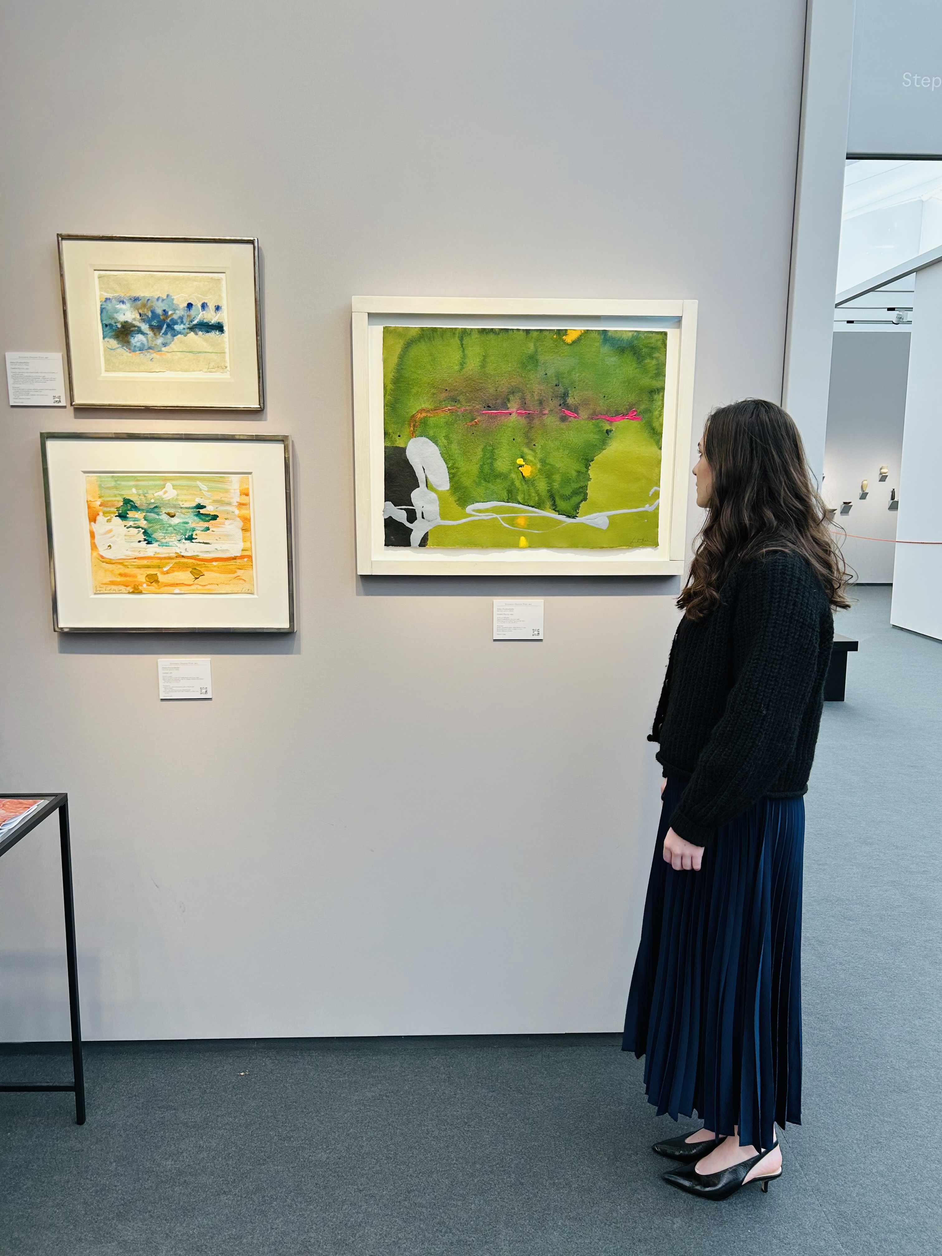 Born into a life of privilege on the Upper East Side of Manhattan, the American painter, draughtsman and printmaker Helen Frankenthaler was educated at Horace Mann, Brearley and the Dalton School in New York (where her first art teacher was the Mexican painter Rufino Tamayo), before completing her studies with the painter Paul Feeley at Bennington College in Vermont. Her early work was strongly influenced by the paintings of Willem de Kooning and Arshile Gorky, as well as the earlier work of Wassily Kandinsky and Joan Miró. Soon after setting up her studio in New York in 1951 Frankenthaler became close friends with the eminent art critic Clement Greenberg, with whom she was to be in a relationship for several years. When the painter Adolph Gottlieb saw her paintings at Greenberg’s apartment, he included a work by her in his selection for a group exhibition at the Kootz Gallery in 1950. The following year Frankenthaler was the youngest artist to be included in the Ninth Street Show, an exhibition organized by members of the New York School (also known as The Club), while later that year the twenty-three-year old artist had her first solo show, of eleven paintings, at the Tibor de Nagy Gallery.