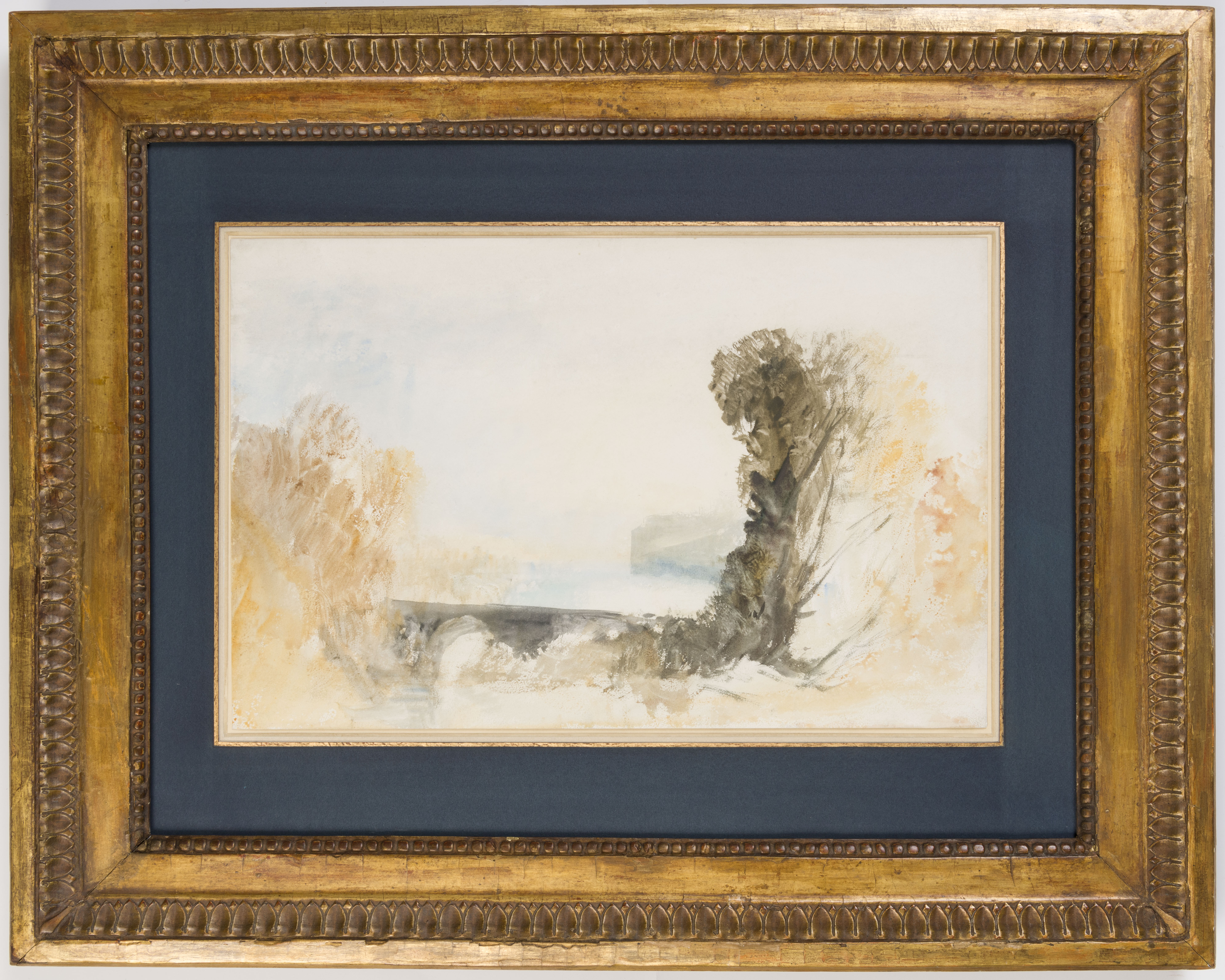 This large watercolour by Turner depicts Blenheim Palace and its grounds with the Grand Bridge, seen from the Woodstock Gate, the main entrance to the park. Two other so-called ‘colour beginnings’ of Blenheim, both in the Turner Bequest at the Tate, also depict the house and its grounds. One of these is quite close in composition to both the finished watercolour and the present sheet, while the other sketch shows the park at Blenheim from a different viewpoint, looking southeast, across the lake. Both works share with the present sheet a great sense of freedom and a summery palette.