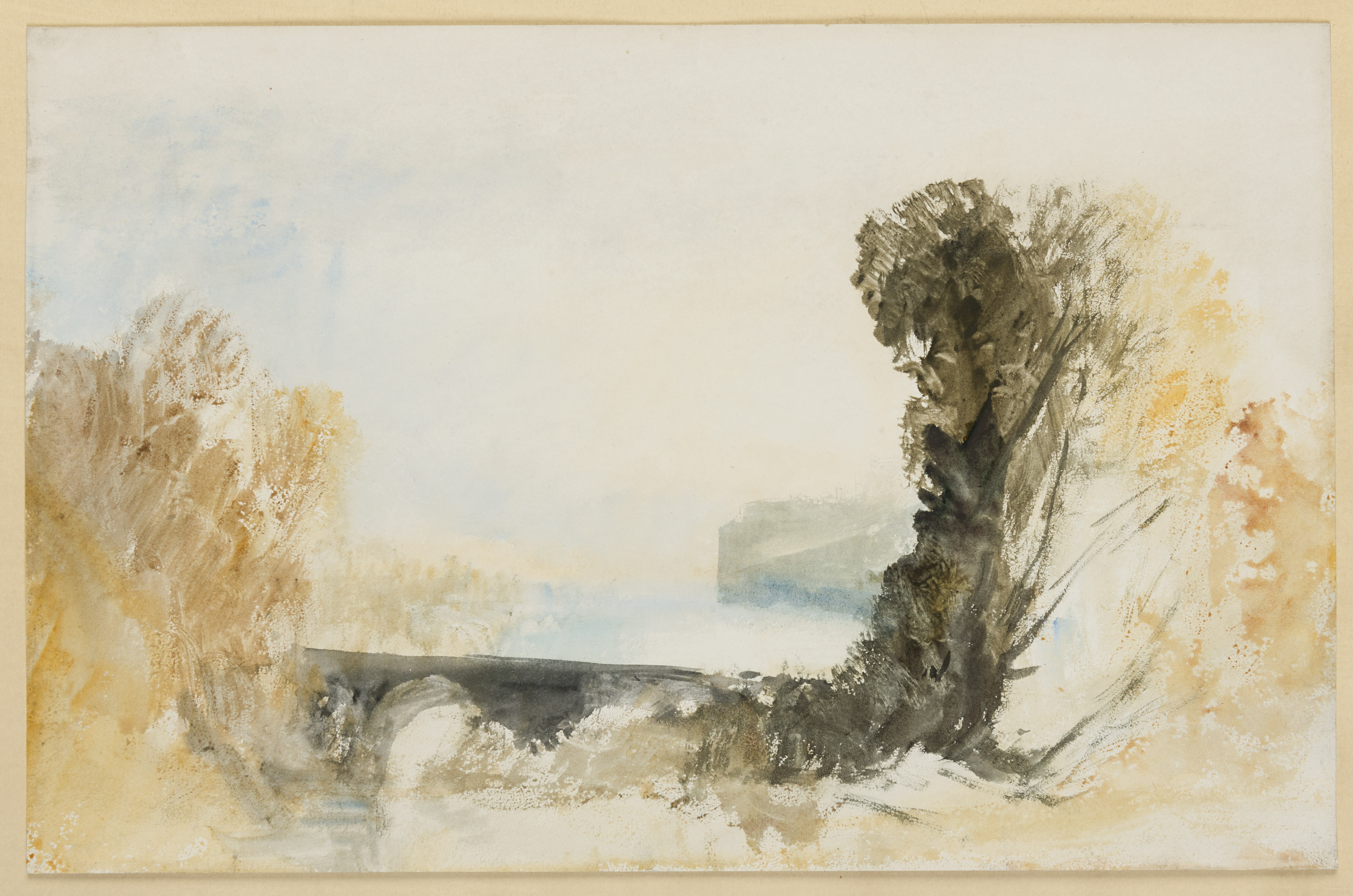 While on a tour of the Midlands between August and October of 1830, to collect new material for the Picturesque Views in England and Wales, Turner visited Blenheim Palace in Oxfordshire, the seat of the Dukes of Marlborough. In his ‘Kenilworth Sketchbook’, now part of the Turner Bequest at Tate Britain3, he recorded in pencil studies the architecture of the Palace, built to the designs of Sir John Vanbrugh between 1705 and 1722, as well as the surrounding park and gardens later designed by Lancelot ‘Capability’ Brown. As Eric Shanes has described Turner’s usual practice, ‘The artist rarely painted out-of-doors, for in the time it took him to create one watercolour in the open-air he could make several in his studio. Usually he would select a line drawing of a subject that he might have made in one of his sketchbooks many years before, a sketch or study that almost invariably contained no indications of lighting, weather or staffage, thus leaving his imagination to invent such details or supply them from memory.’ Turner was particularly struck by the 18th century Grand Bridge at Blenheim, built by Vanbrugh in 1708, which was more than 120 metres in length and some fifteen metres tall, with a central arch thirty metres wide5.